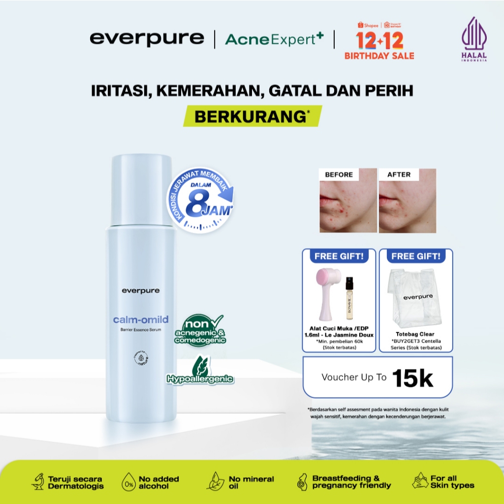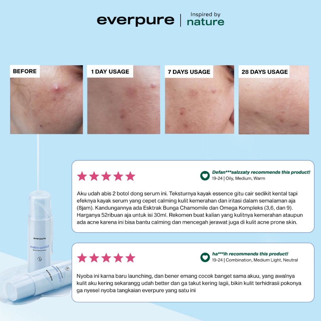 EVERPURE Calm-omild Barrier Essence Serum - Essence Serum Wajah Berjerawat Sensitif Kering Redakan Kemerahan & Iritasi Kulit Akibat Jerawat Rawat Skin Barrier Menenangkan Kulit Dengan Esktrak Bunga Chamomile & Omega Kompleks [BPOM] 30ml