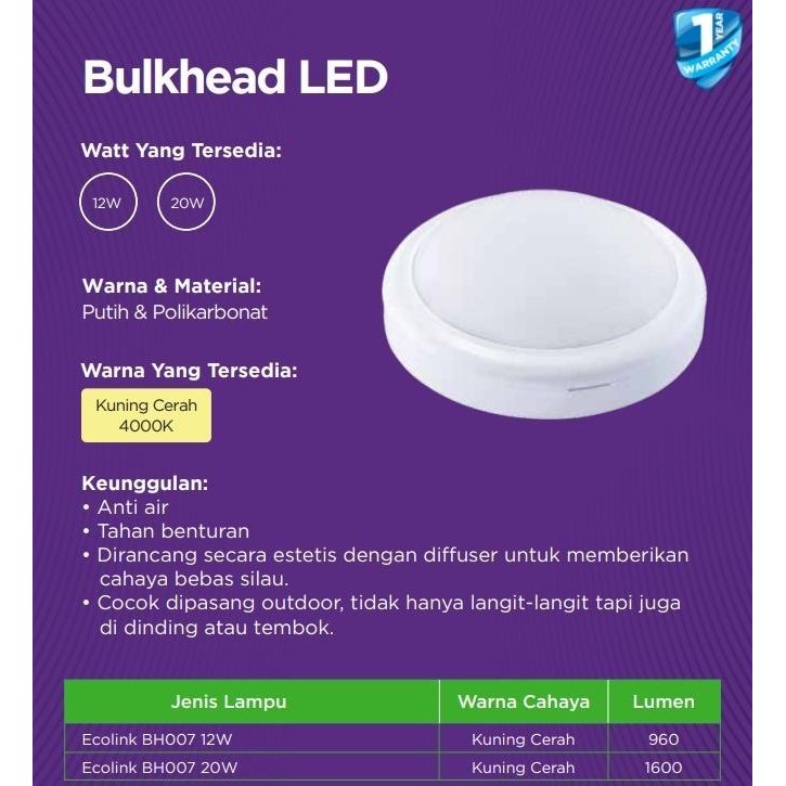 Ecolink Lampu Panel Led Ob Bulat Bulkhead Bh007 20W 865 Putih - Asli