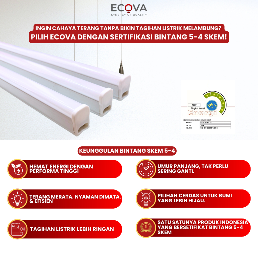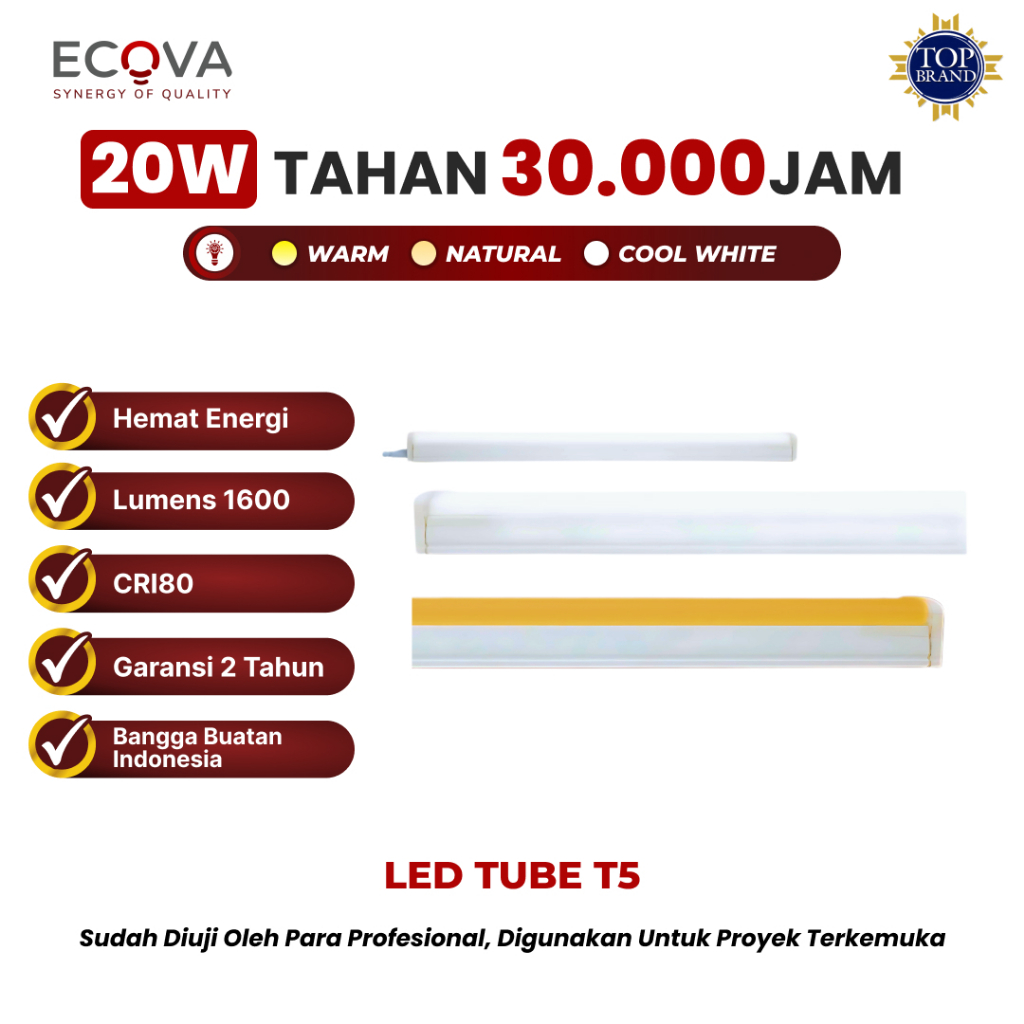 Ecova - Lampu TL T5 Terang Hemat Energi & Tahan Lama Tube Light Putih | Natural | Kuning | 20W 120cm