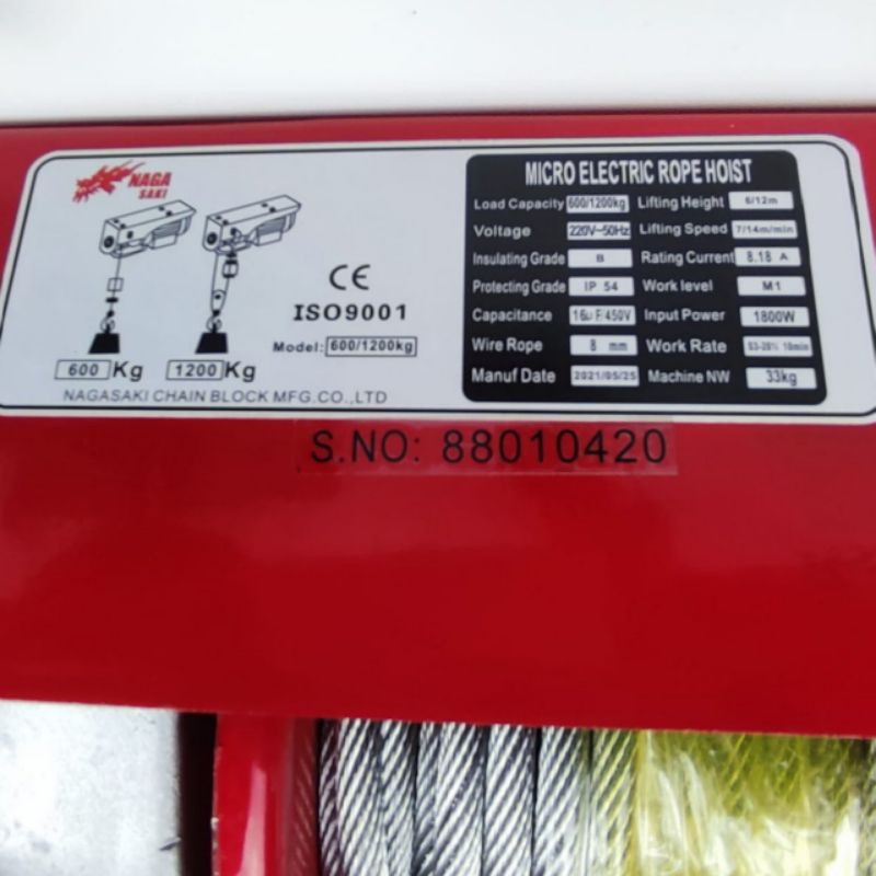 Electric Mini Crane Hoist PA1200 Katrol Listrik 1200 Kg Nagasaki PA 1200 Seling 12 Meter
