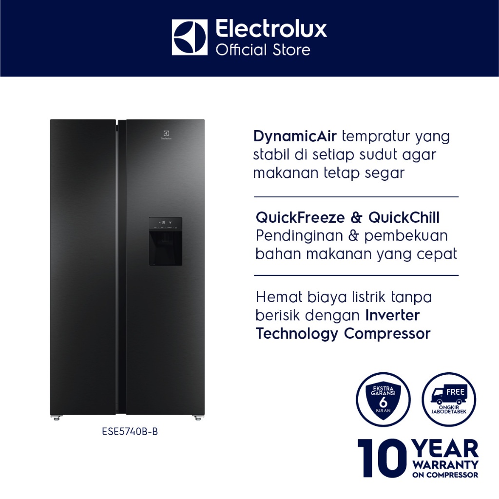 Electrolux Kulkas Side by Side ESE5740B-B 571L Teknologi Inverter - Hemat Energi - Fresher Air - Filter Karbon Anti Bau Garansi 1 Tahun 10 Tahun Kompresor / ESE 5740 B-B / ESE5740 B-B
