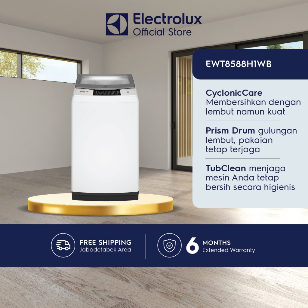 Electrolux Mesin Cuci Top Loading 8.5kg - Bedcover - Low Watt - Tub Clean - Garansi 10 Tahun Motor - EWT8588H1WB