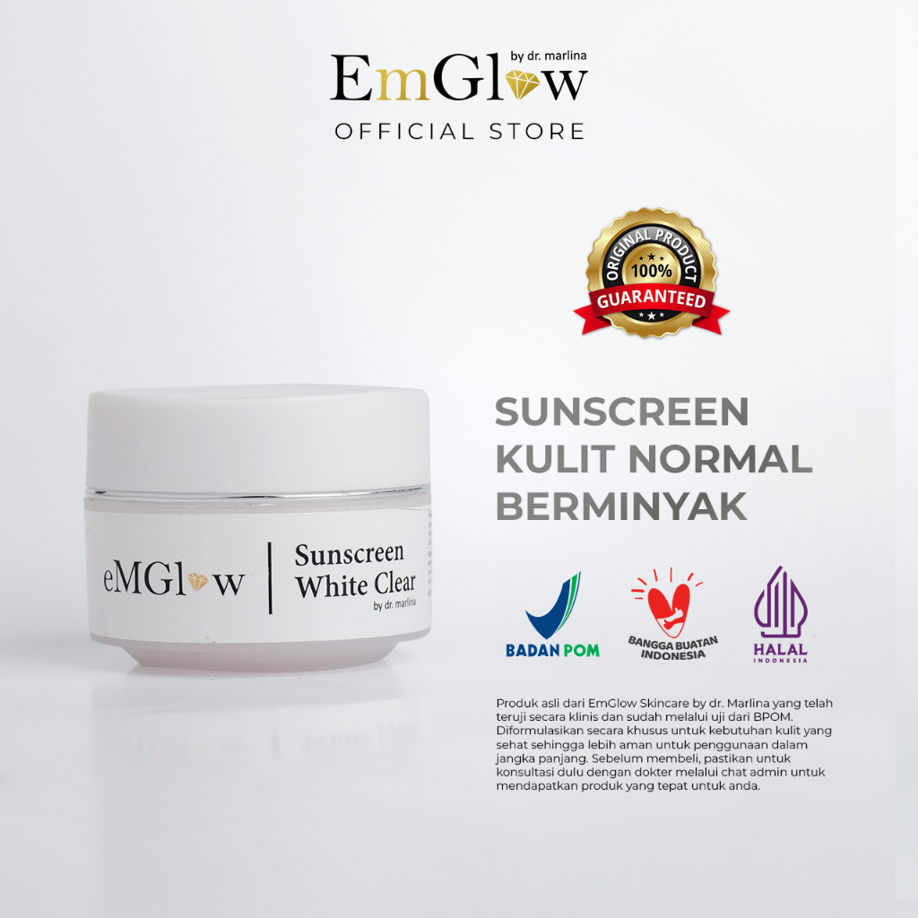 EMGLOW - SUNSCREEN WHITE CLEAR | Ectoin Sunscreen Pencerah SPF 30+ PA+++ Untuk Kulit Normal & Cenderung Berminyak