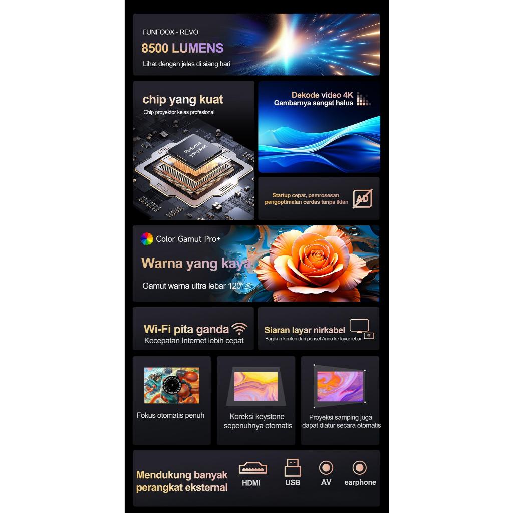 FUNFOOX WA-REVO Paket luar ruangan proyektor 120 inci + 100inci layar Proyektor Rumah , 4k Full HD 1080p Asli, Fokus Otomatis dan Keystone, Kecerahan Lumen Tinggi 9800 untuk Layar Lcd Projector