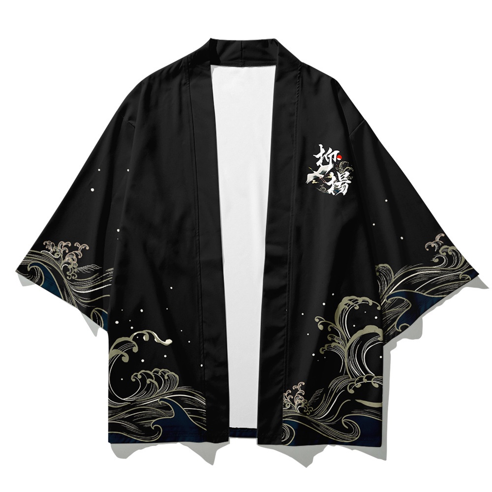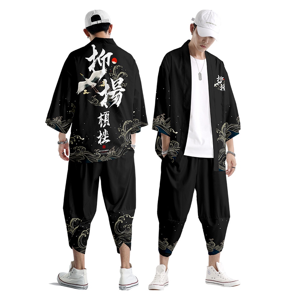 Fashion Men Women Loose Japanese Traditional Crane Cosplay Streetwear Casual Hitam Cardigan Fashion Harajuku Kimono Jepang Wanita Pria Beach Pakaian haori