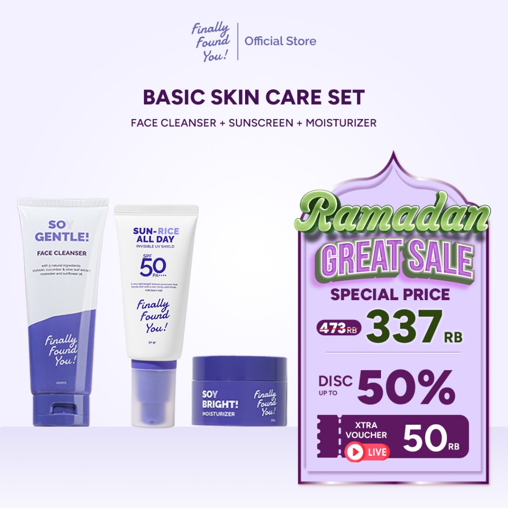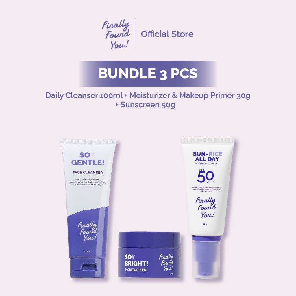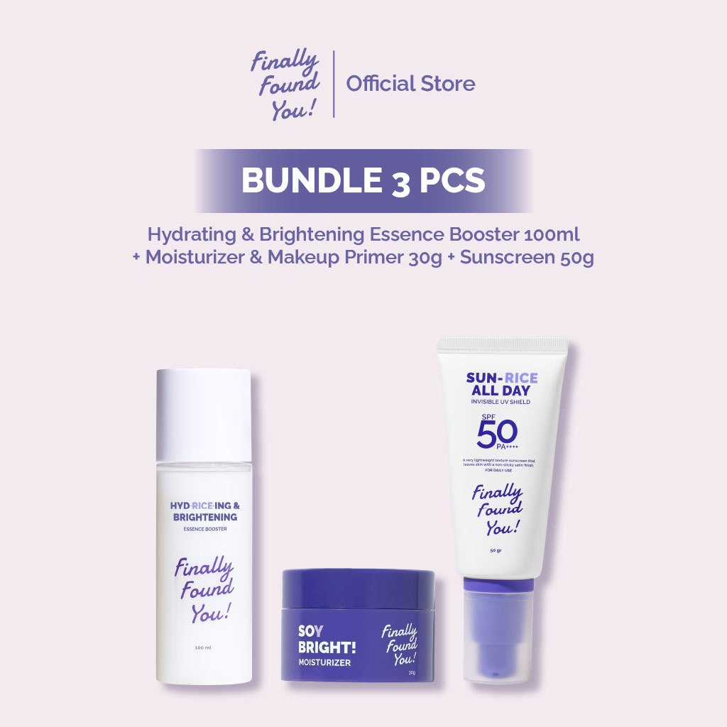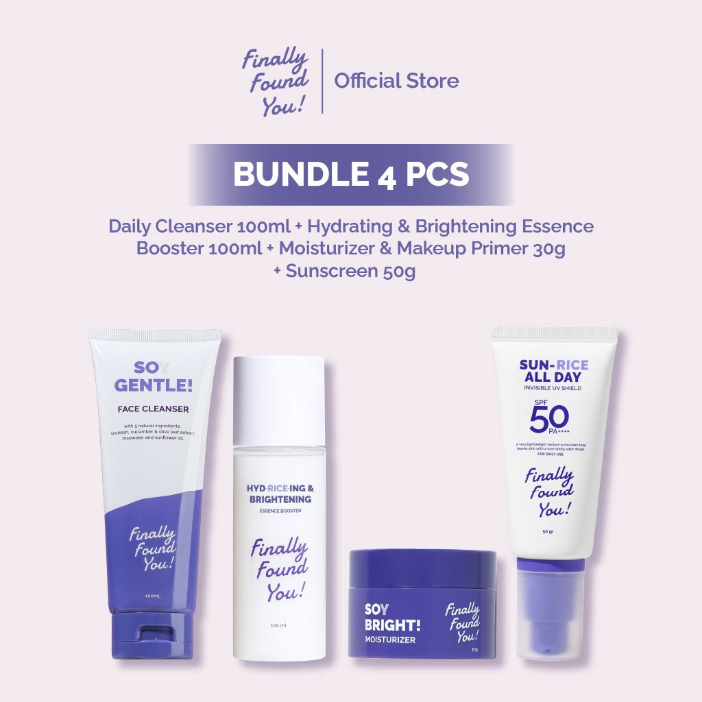 Finally Found You! BUNDLE BASIC SKINCARE: Soy Gentle Face Cleanser + HYDRICEING & BRIGHTENING Essence Booster + Soy Bright Moisturizer & SUN-RICE ALL DAY Invisible UV Shield