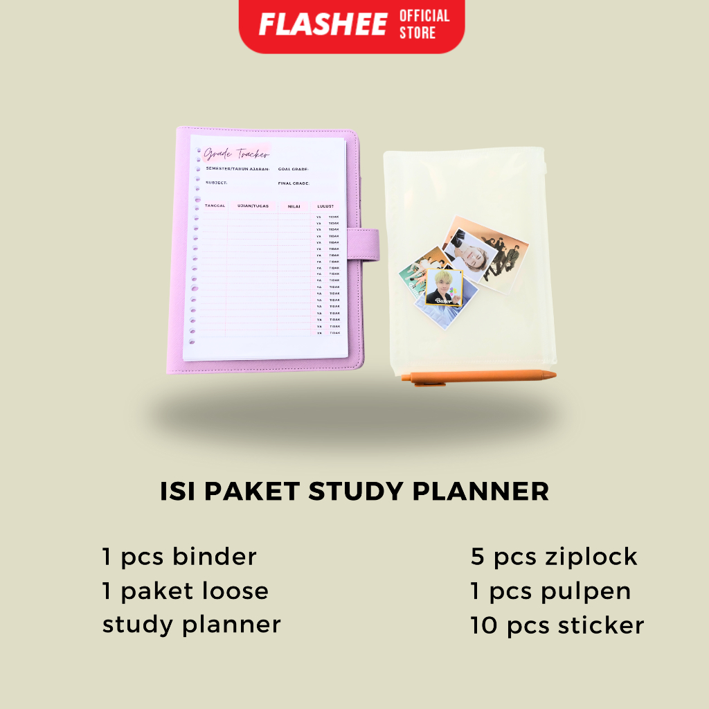 Flashee Paket Binder Polos Untuk Belajar Study Planner A5 20 Ring B5 26 Ring (Binder, Study Planner, Kantong Zip, Pulpen, Sticker)