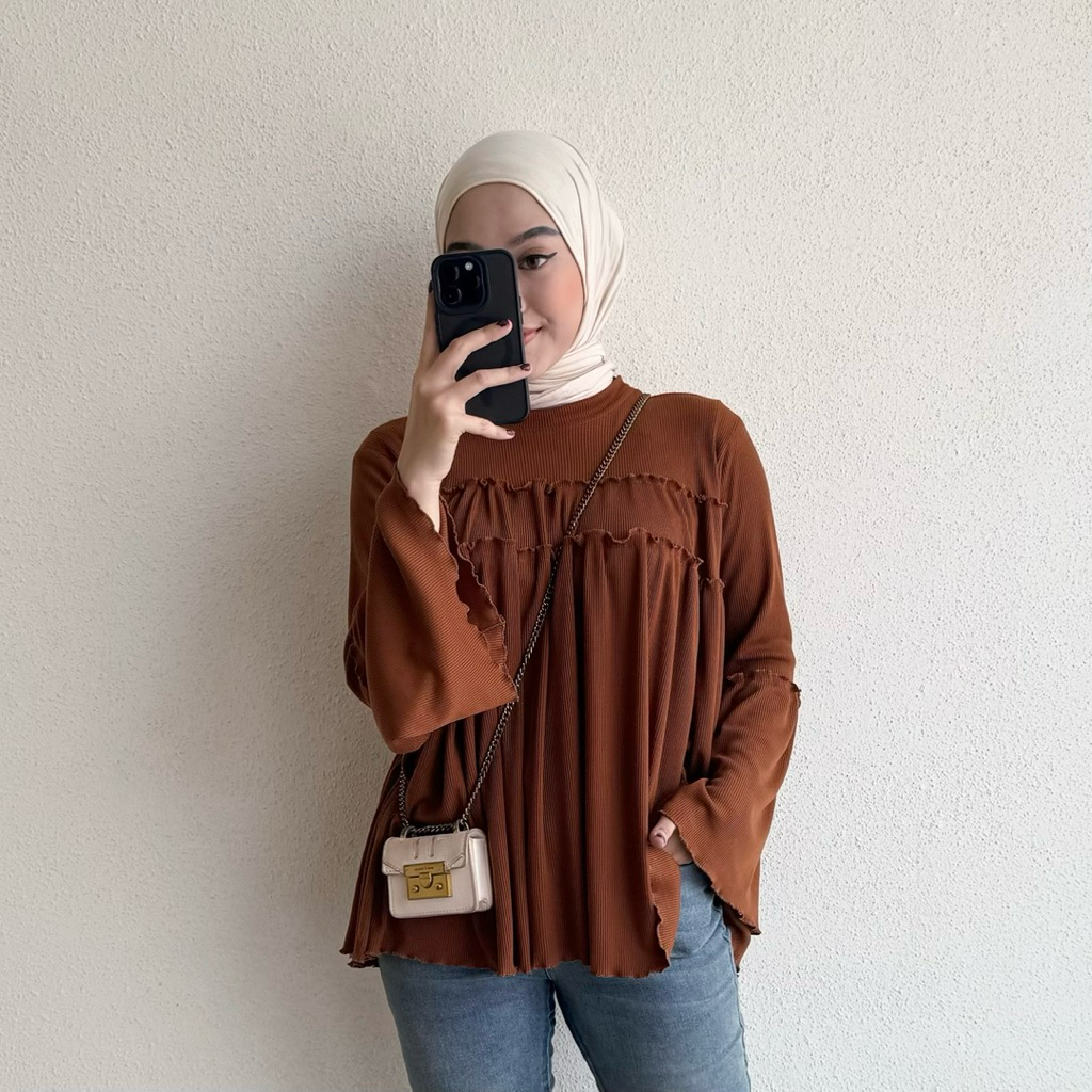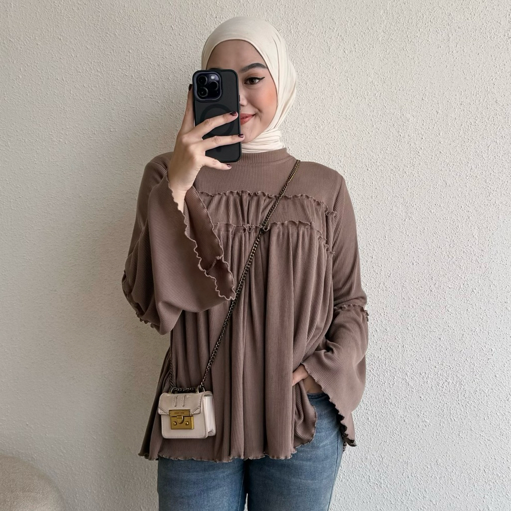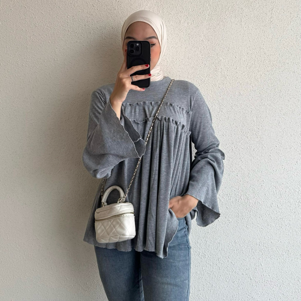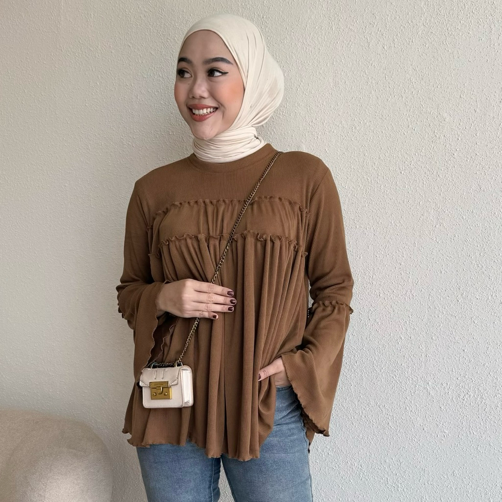 Floral Id - Blouse Knit Rib Taupia Kaos Polos Lengan Panjang Ruffle Basic Premium