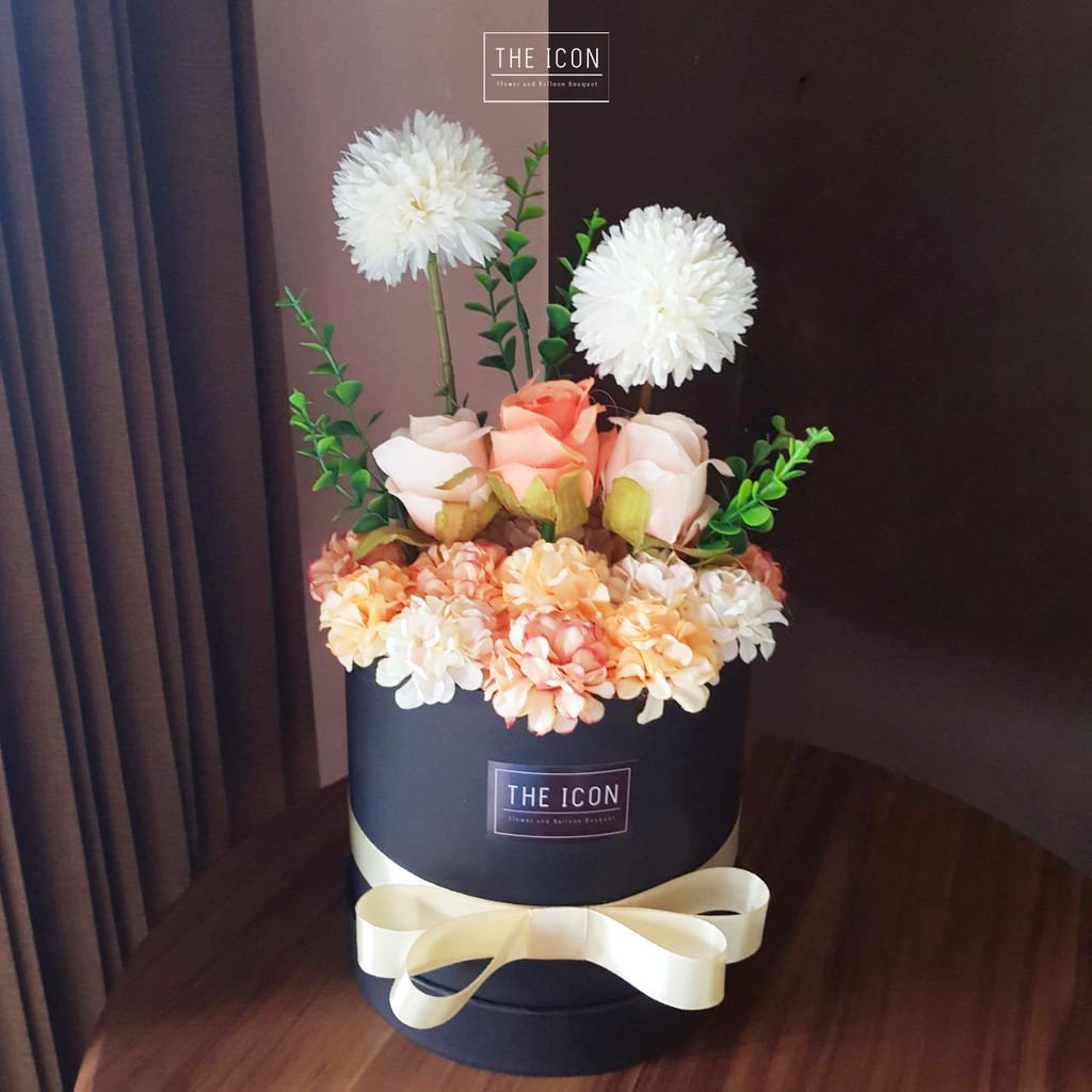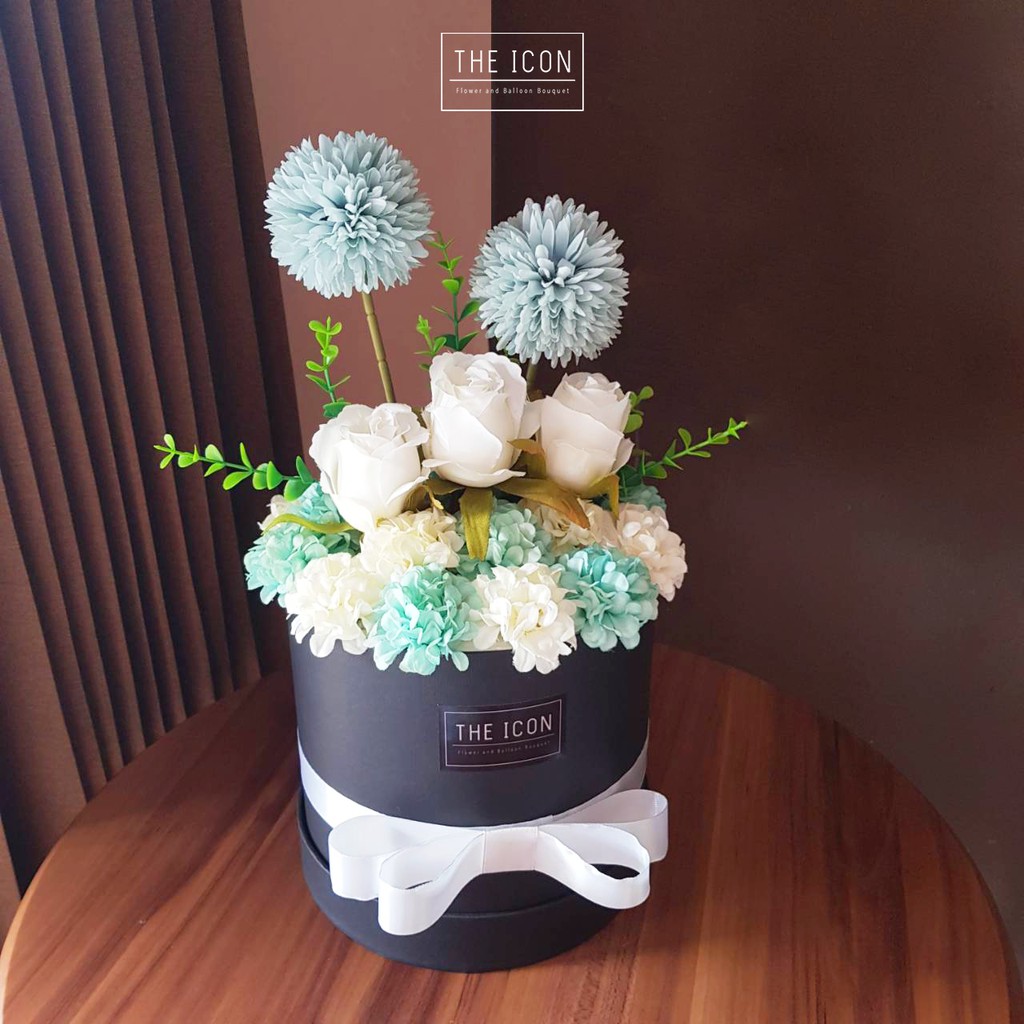 Flower Box Pompom Hydrangea dan Mawar | Buket Bunga Box | Bloom Box Anniversary | Bunga Pajangan
