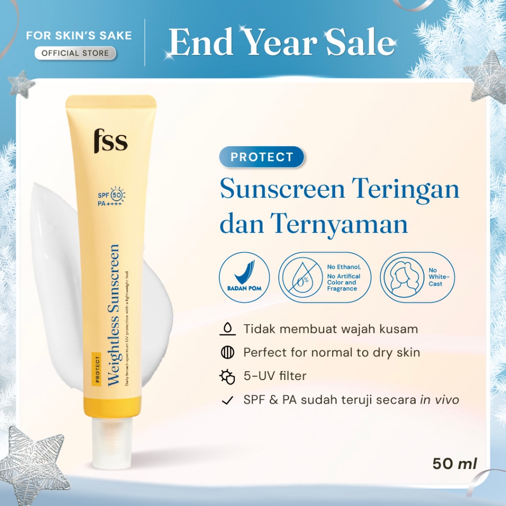 For Skin's Sake FSS Weightless Sunscreen SPF 50 PA ++++ Perlindungan Maksimal Untuk Kulit Normal Hingga Kering.