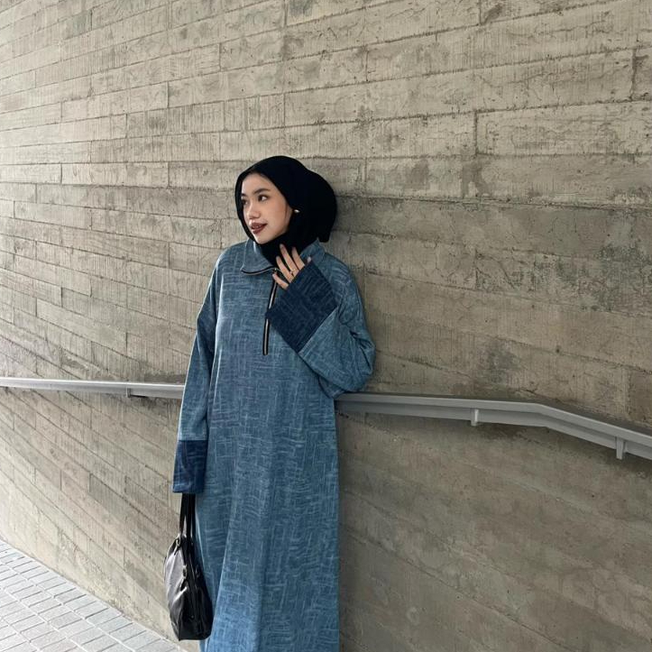 PURE- Dress Raisa denim Knit abaya Hari Raya Bahan Nyaman Knit Premium Desain Elegan Cocok untuk Acara Spesial dan Perayaan