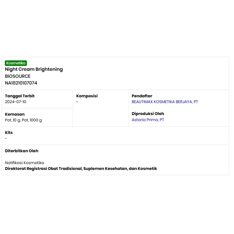 BIOSOURCE Brightening Night Cream 1KG | Skincare Cream | BPOM