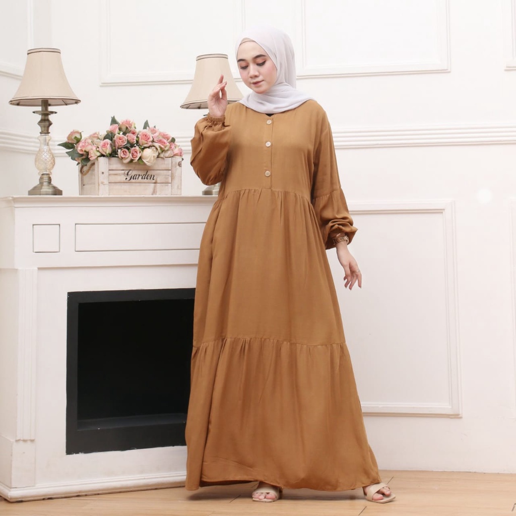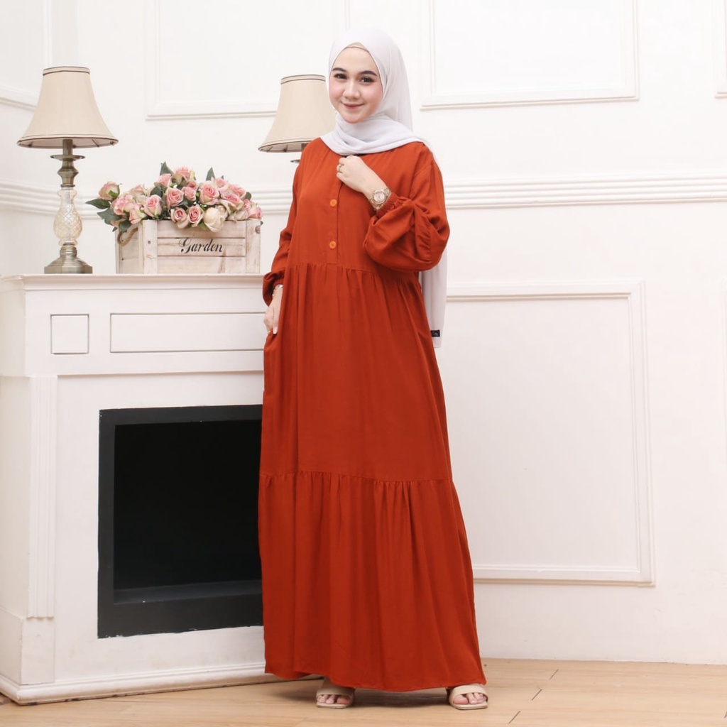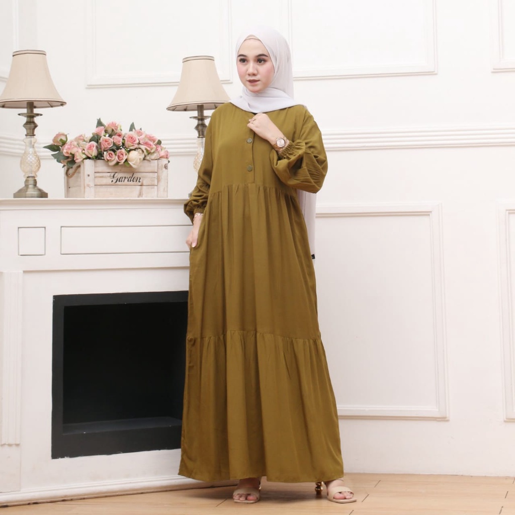 GAMIS RAYON MAXI MODEL LENGAN BALON | GAMIS CANDA MAXI | GAMIS RAYON POLOS SUSUN BUSUI FRIENDLY 3 KANCING DEPAN ATAS
