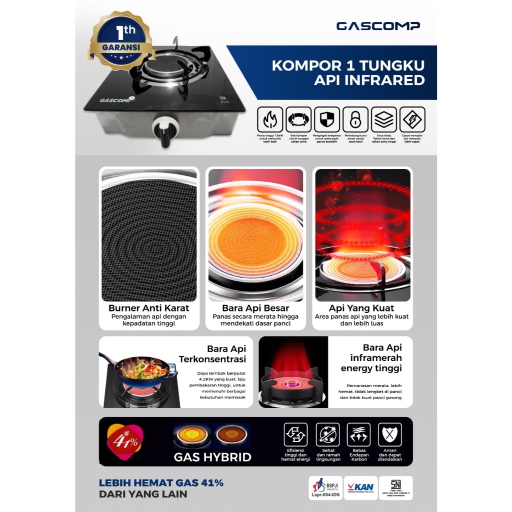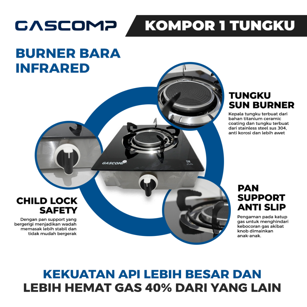 GASCOMP Kompor Gas 1 Tungku Kompor Bara ST01 IR Kompor Gas Kaca Tungku 1 Infrared dengan Api Bara Masak dan Panggang Lebih Cepat Merata