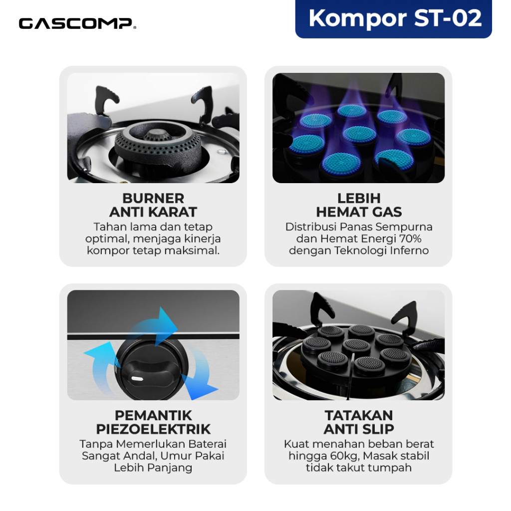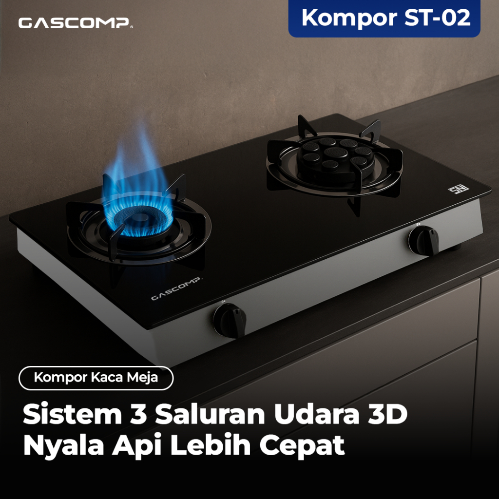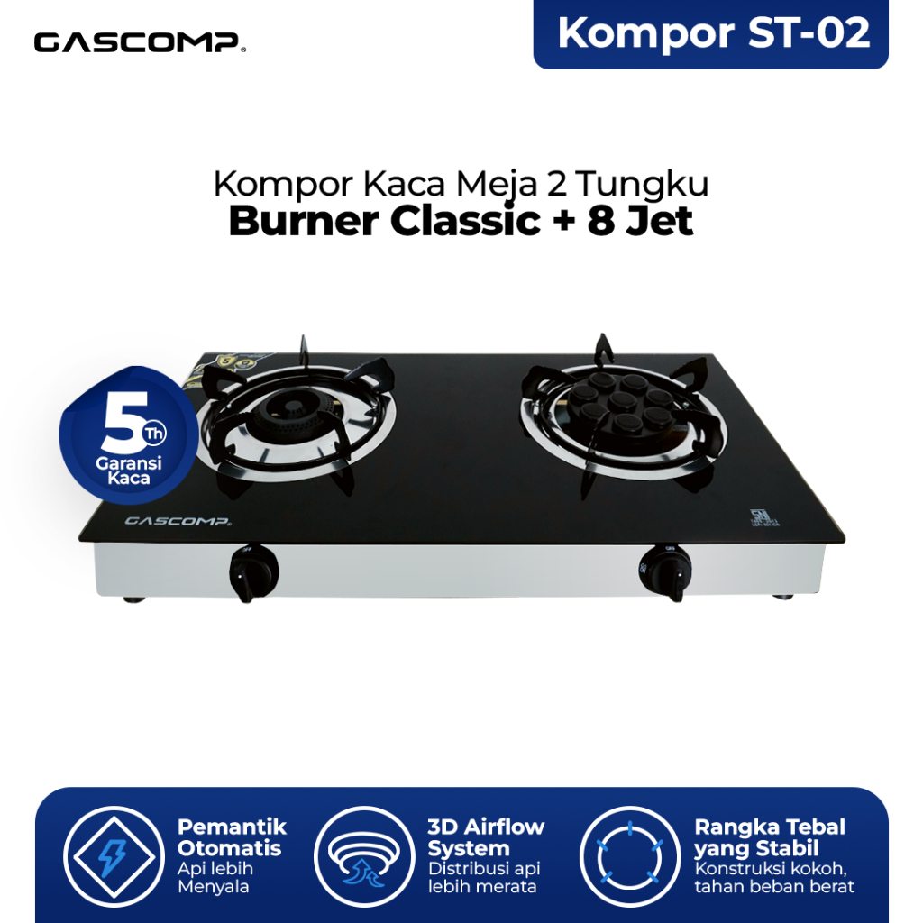 GASCOMP Kompor Gas Meja Kaca Classic + 8 Jet | Kompor Gas 2 Tungku Elegan | Api Besar Hemat Gas | Kompor Dapur Modern