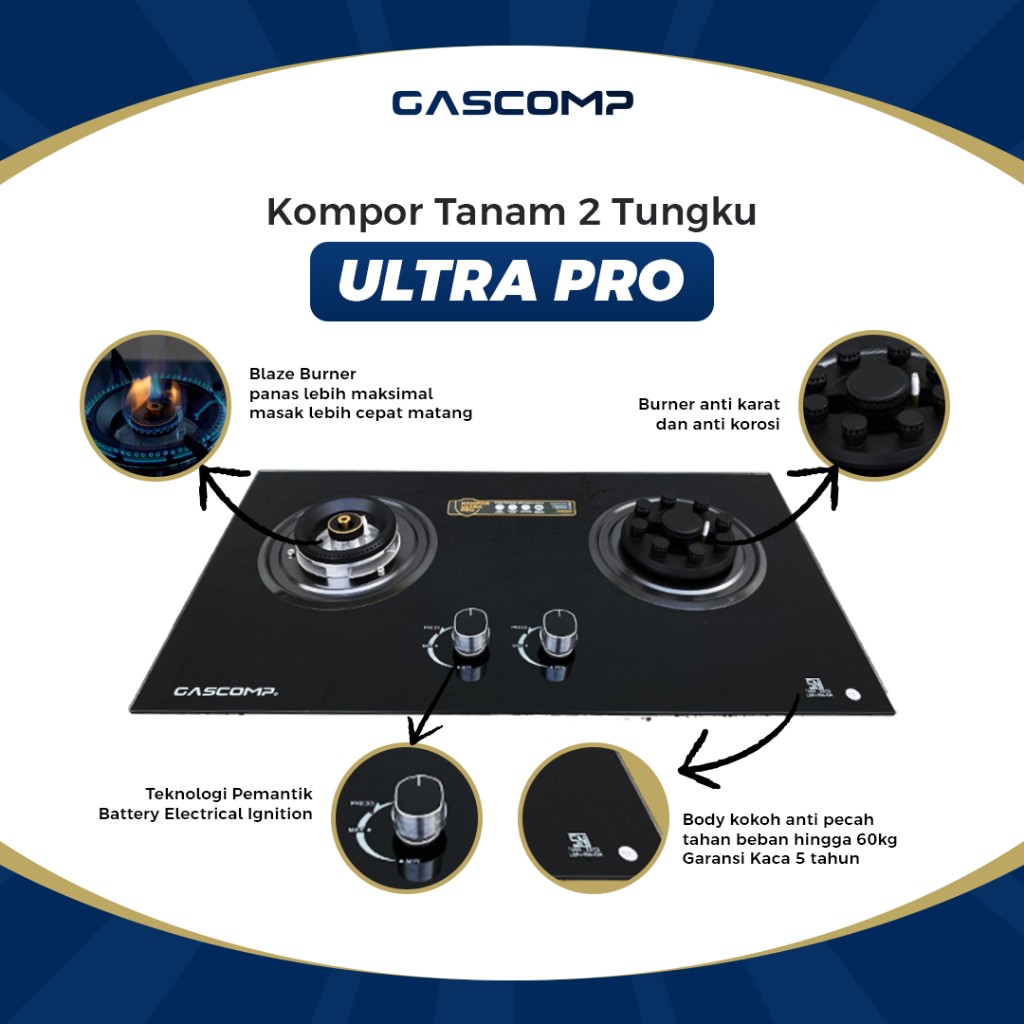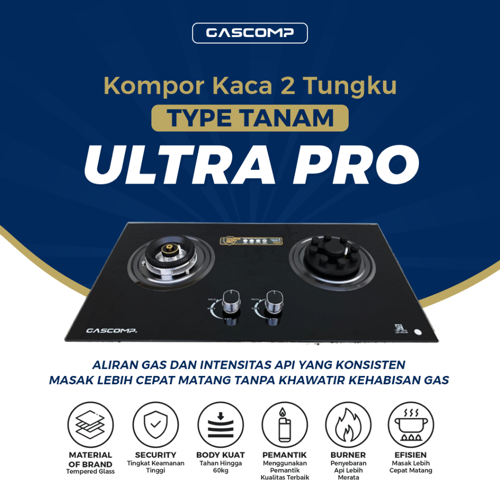 GASCOMP Kompor Tanam 2 Tungku Api Tornado Kompor Gas Tanam Kaca 2 Tungku Ultra Pro Cocok Untuk Aktivitas Memasak Lebih Banyak - Kompor Gas Ultra Pro Blaze Burner