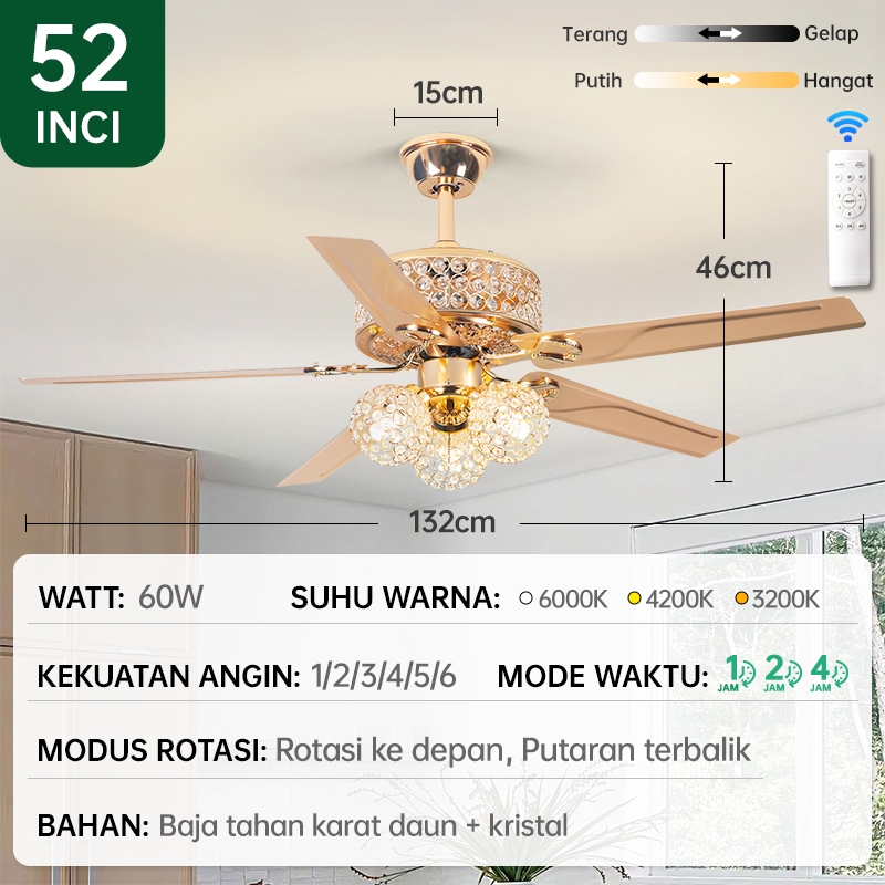 GOGEOUS Lampu Kipas Angin Plafon Kristal 3 Warna 52Inci 6Kecepatan Kipas Lampu Gantung Plafon Remote