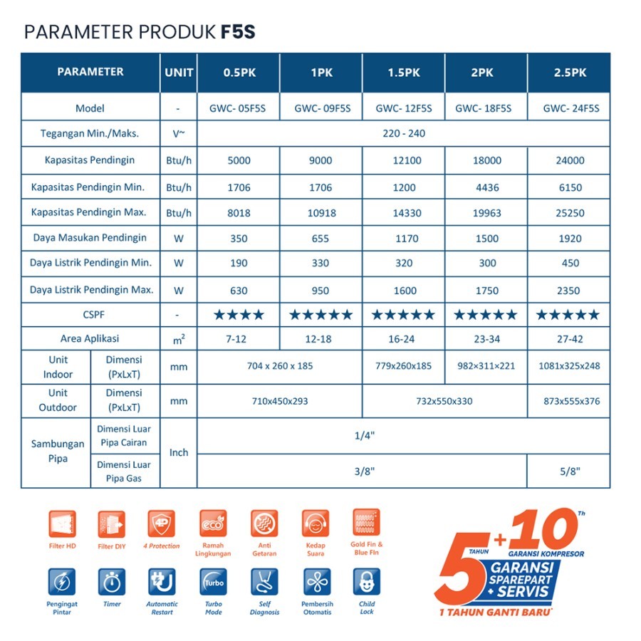 GREE AC GWC-05F5S Series Inverter 0.5 / 1/2 PK F5S Putih