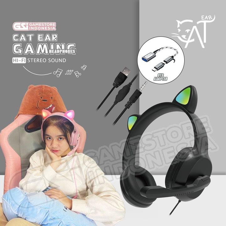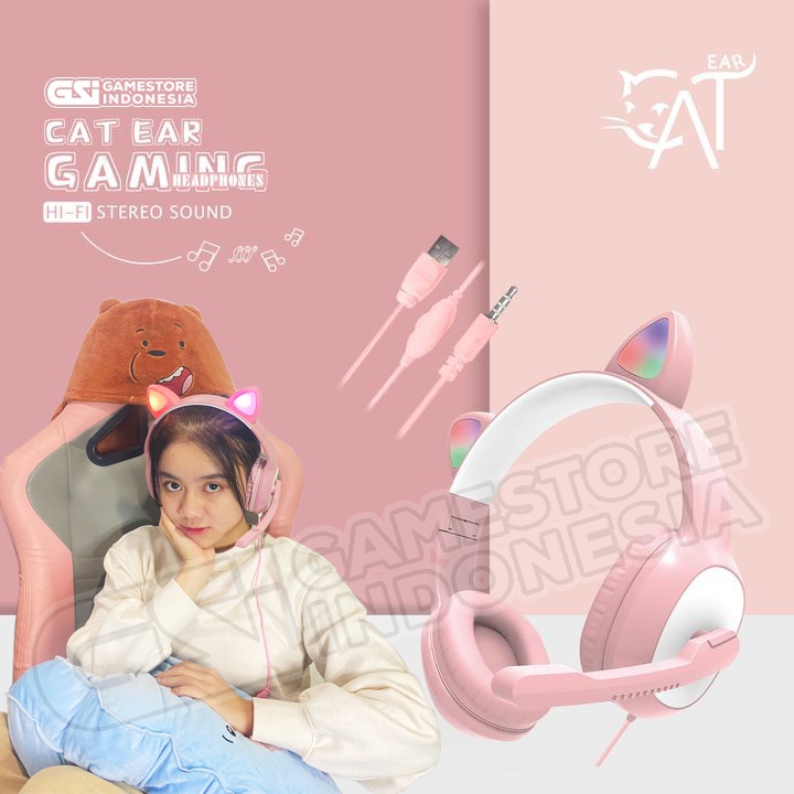 GSI Headset Gaming Kucing LED - Imut Telinga Kucing + Microphone Pakai Kabel