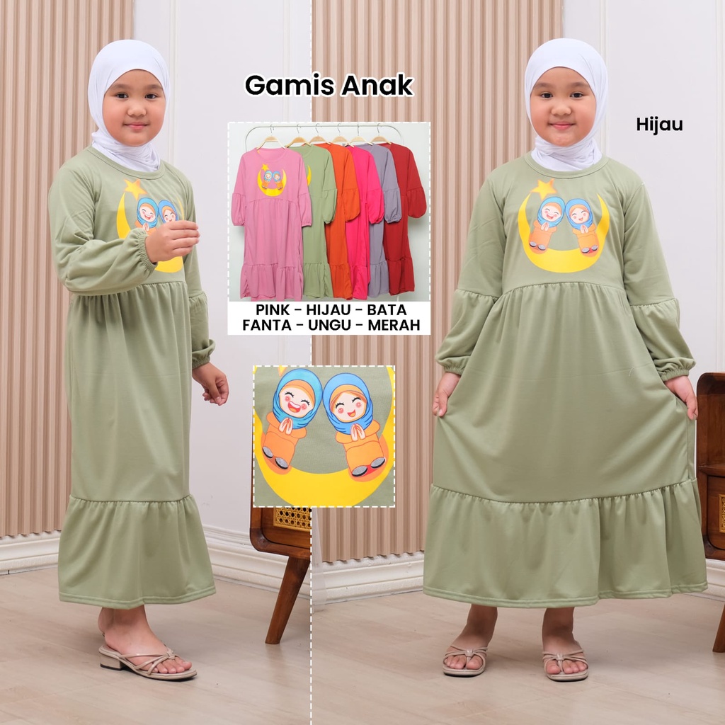 Gamis Anak Perempuan Model Tangan Balon Rumbai Bawah Buat Anak 3-9Tahun Motif Bulan Bintang ( Real Pic )