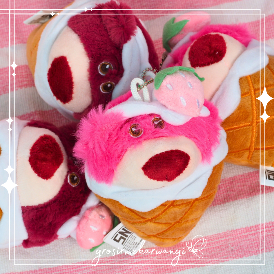 Gantungan Kunci Lotso Boneka Ice Cream Cone Soft Cute Karakter Kartun Beruang Pink Es Krim Bulu Keychain Lotso Strawberry