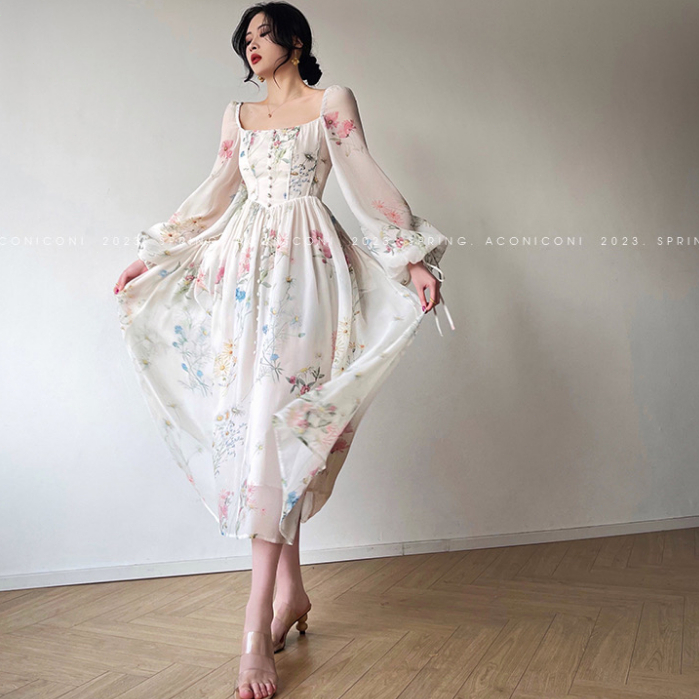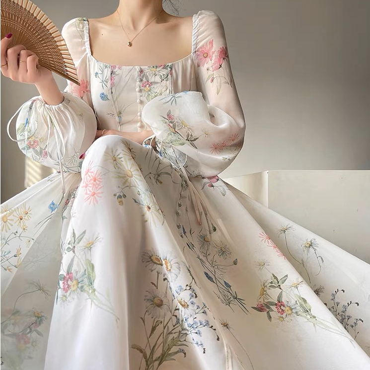 Gaun bermotif Prancis baru 2023/gaun leher persegi/rok panjang/dress