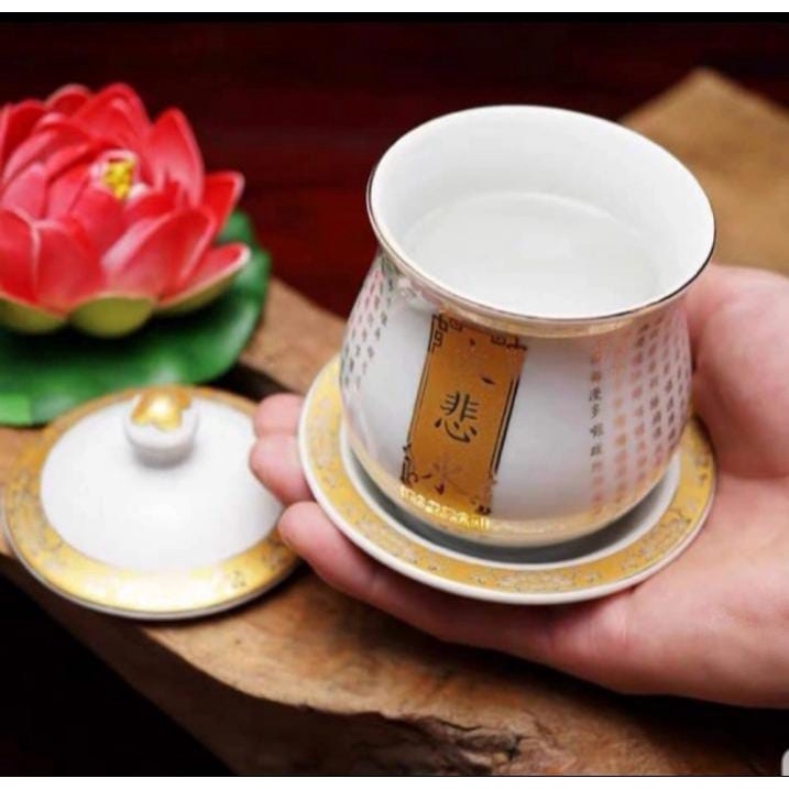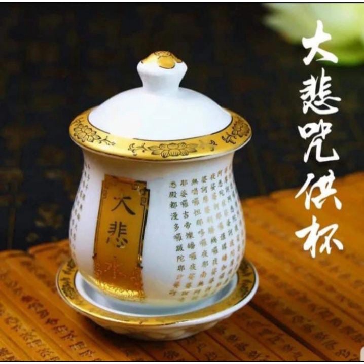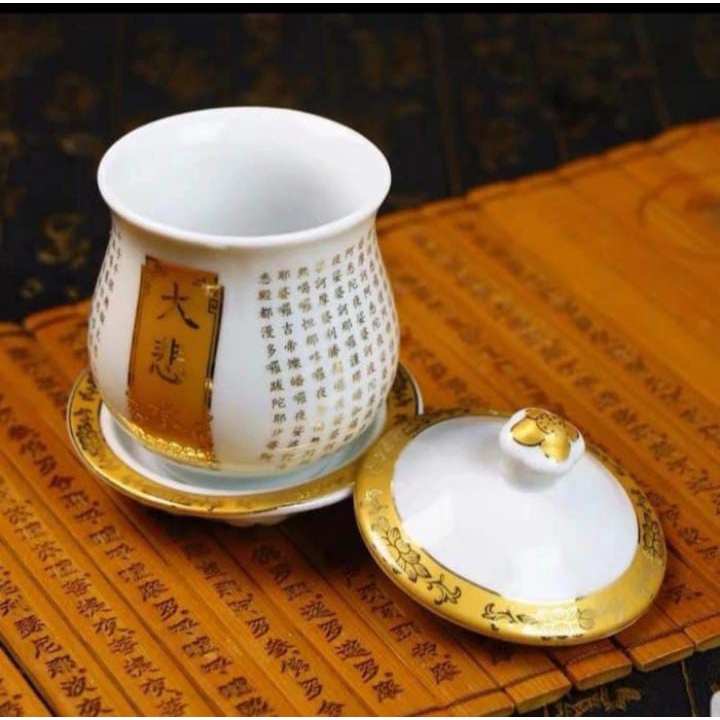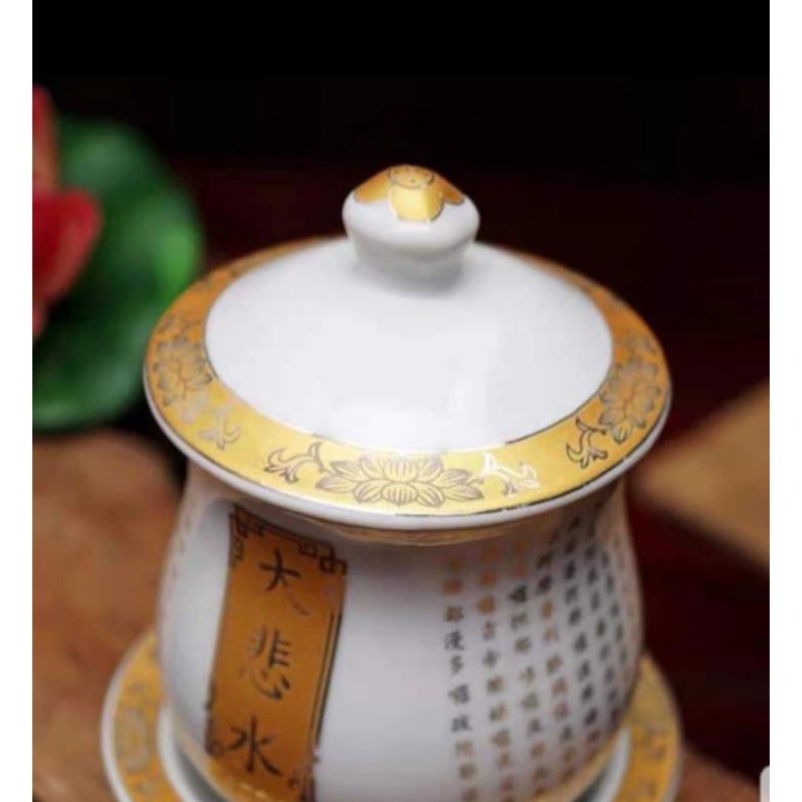 Gelas Persembahan Air Keramik Ta Pei Cou Putih Motif Emas Besar