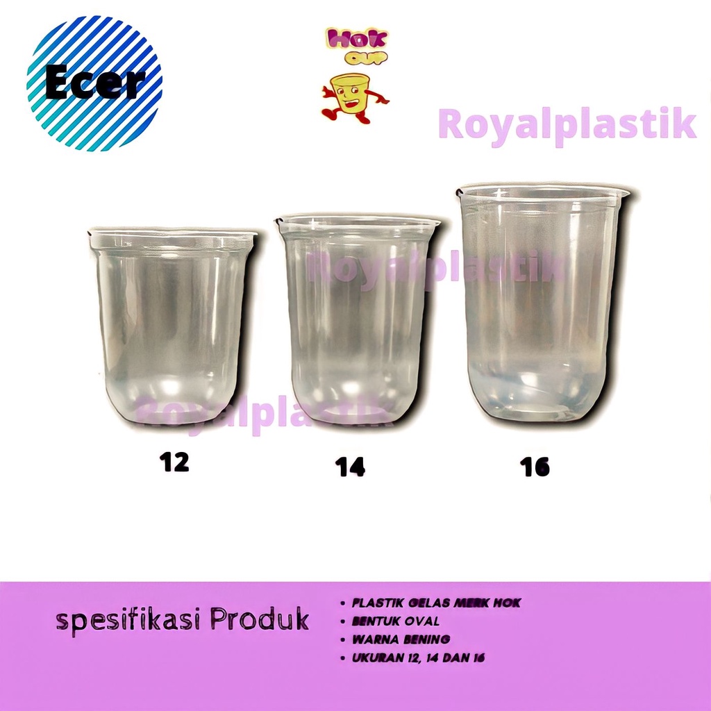 Gelas Plastik Cup Oval Merk Hok Warna Putih Bening Ukuran 12, 14 Dan 16 Harga Satuan Lebih Terjangkau