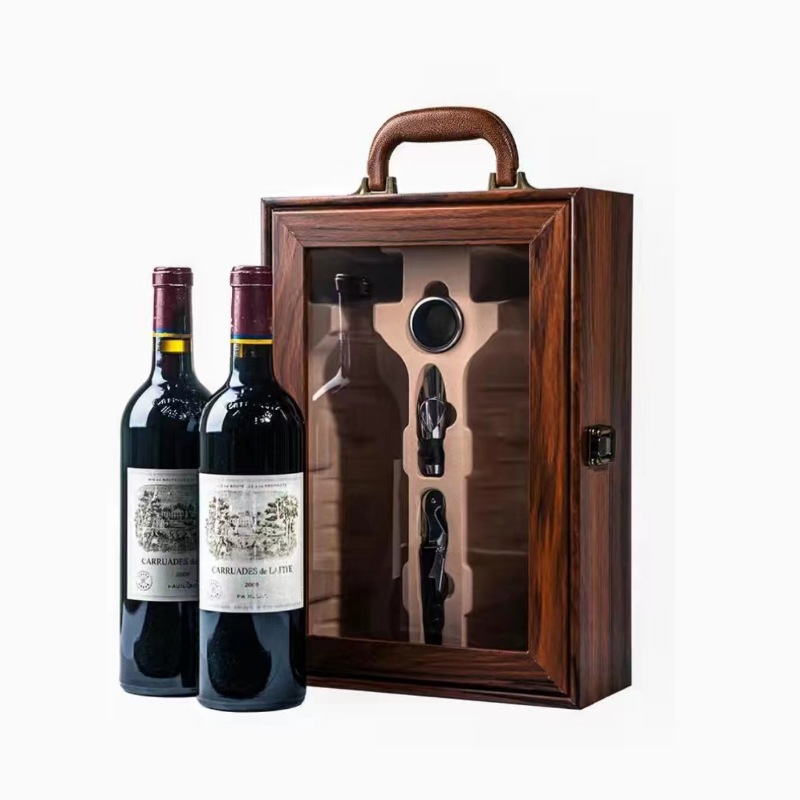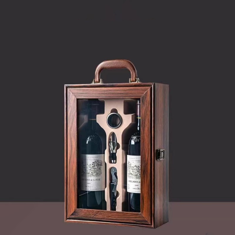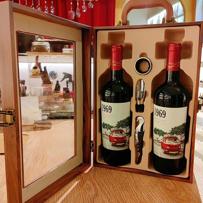 Gift Wine Box Portabel Dengan 3 Buah Alat Minum Kotak Kado Hardbox Kayu Buka Kotak Hadiah Anggur Jendela