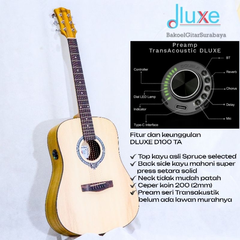 Gitar Dluxe D100 Transkustik original pabrik setara solid ceper koin 200