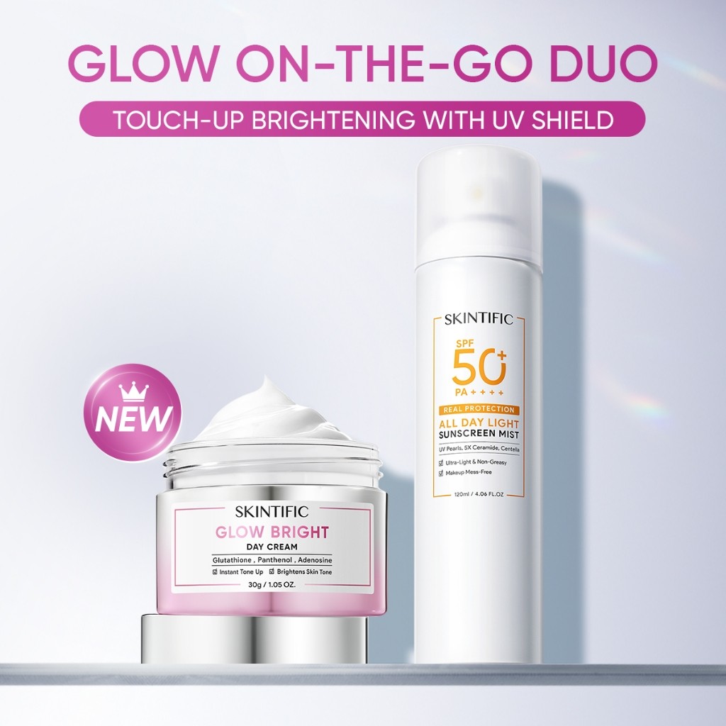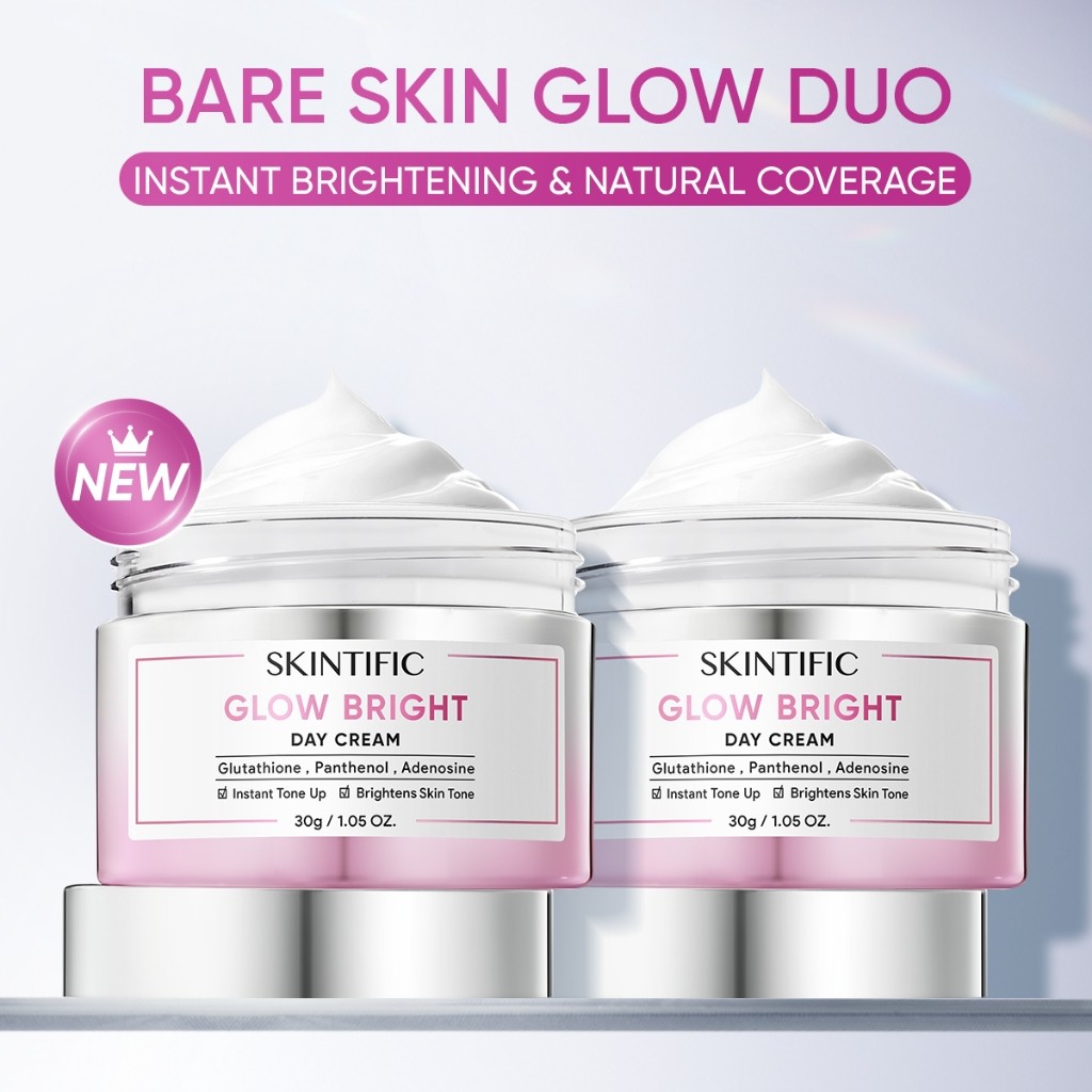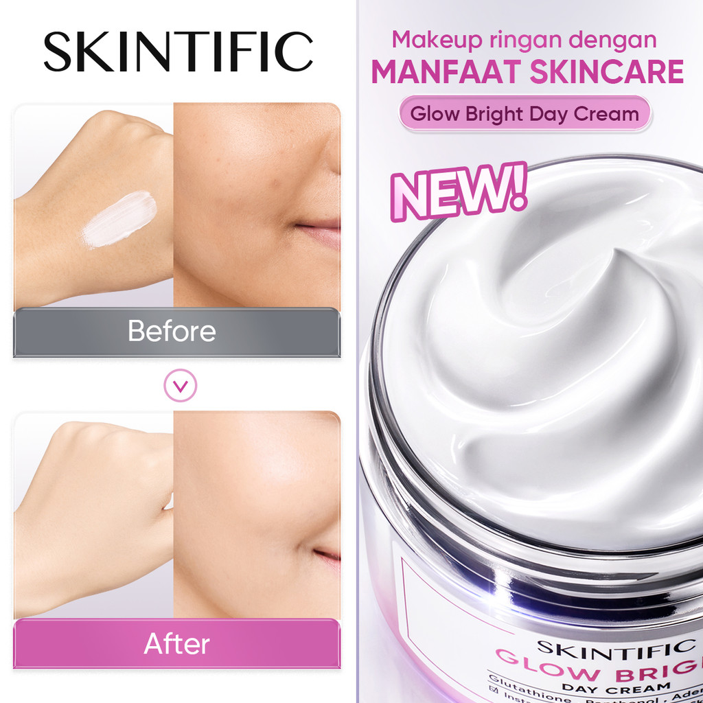 SKINTIFIC – Glow Bright Day Cream – Tone Up Moisturizer untuk Wajah & Leher – Brightening Whitening Lazy Cream Foundation Look – Quick Makeup Day & Night Facial Moisturizer dengan 2% Niacinamide, Panthenol & Adenosine