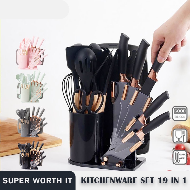Silicone Set Spatula Tahan Panas 19pcs Sutil Talenan Pisau Capitan Pegangan Kayu