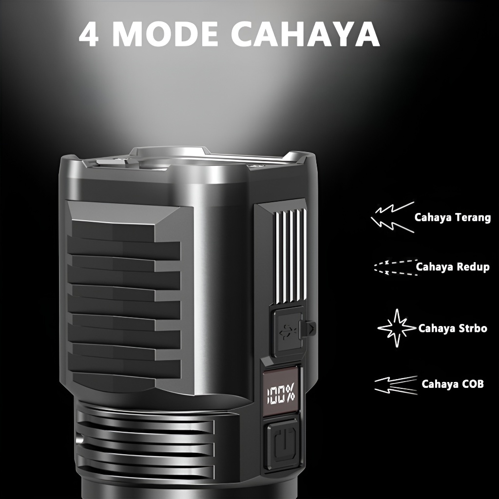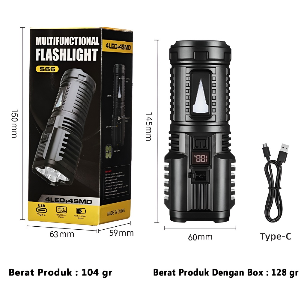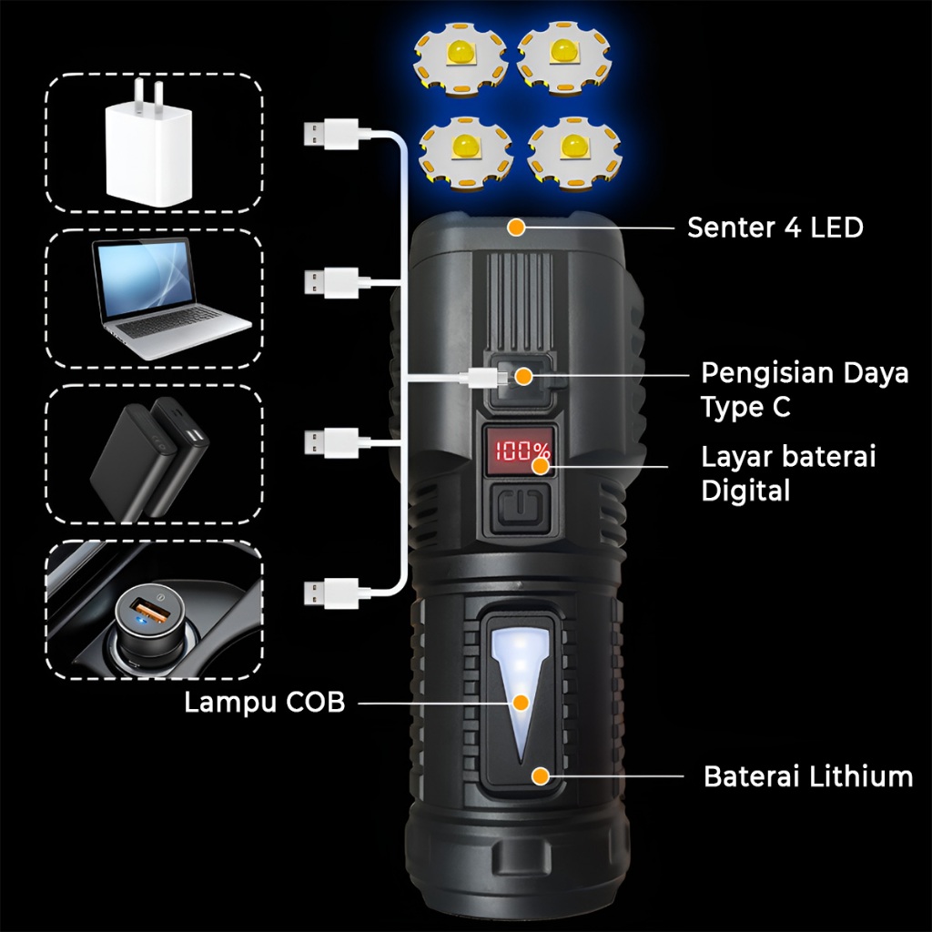 H2S Senter LED 4 Mata COB Rechargeable HS-S66