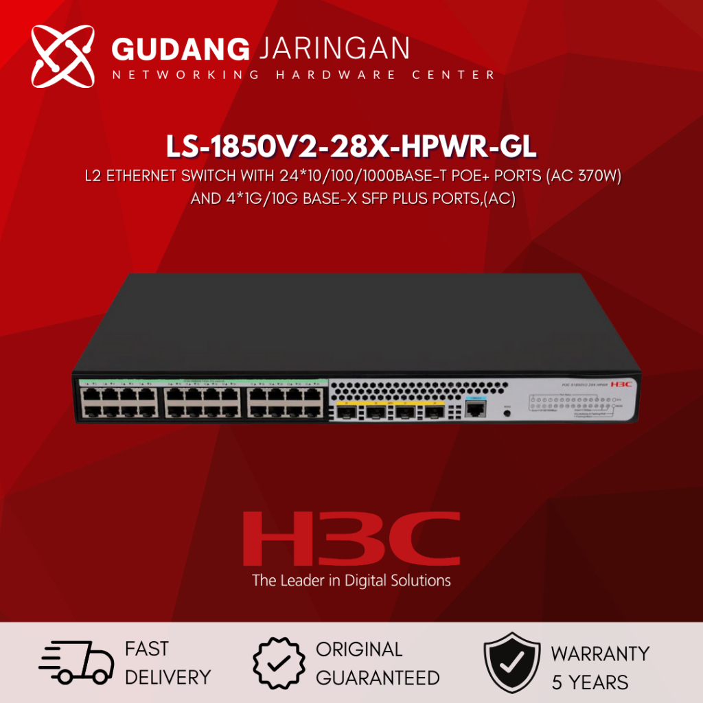 H3C LS-1850V2-28X-HPWR-GL L2 Ethernet Switch with 24*10/100/1000BASE-T PoE+ Ports (AC 370W) and 4*1G/10G BASE-X SFP Plus Ports,(AC)