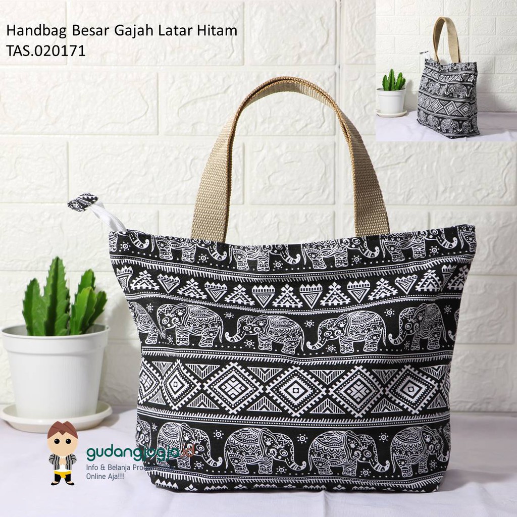 HANDBAG KANVAS / TAS JINJING KANVAS BESAR MOTIF GAJAH LATAR HITAM / TAS KANVAS / GUDANGJOGJAID