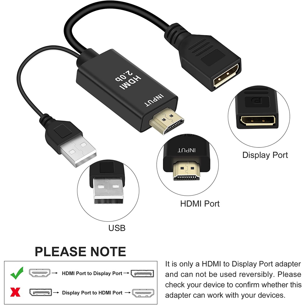 HDMI 2.0 4K Male to DP Display Port Female with USB Power - HDMI to DP