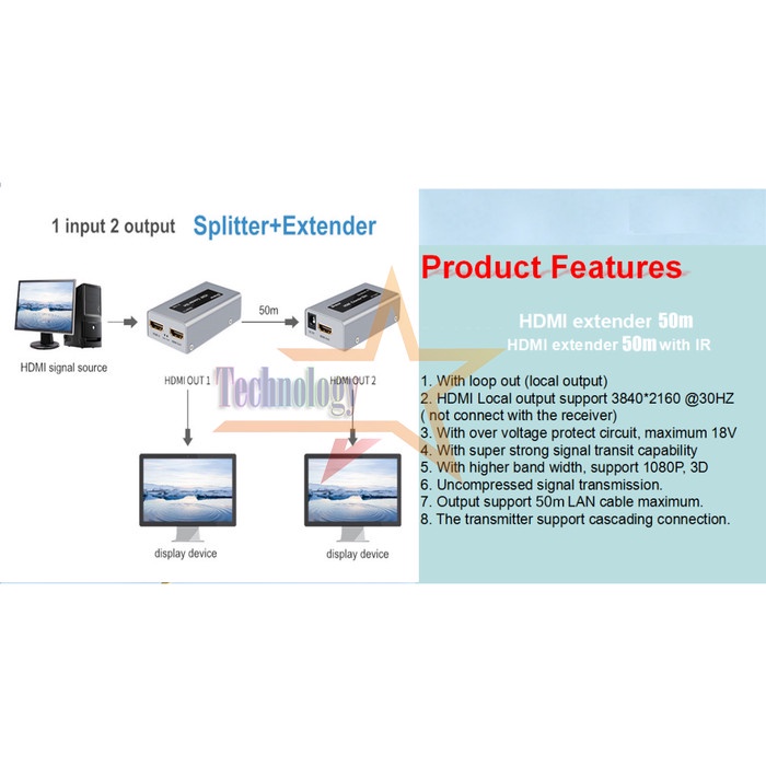 HDMI Splitter Extender via UTP LAN Cable (up to 50 m) Support Extend