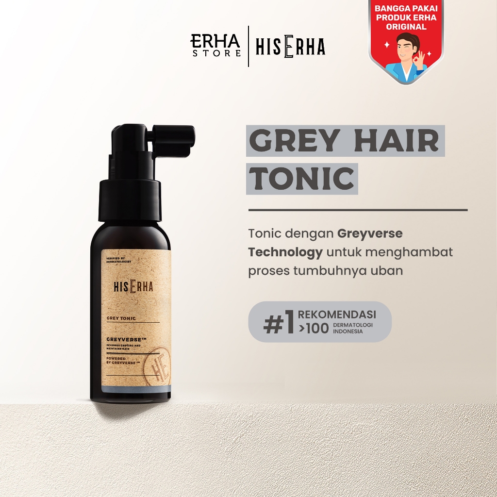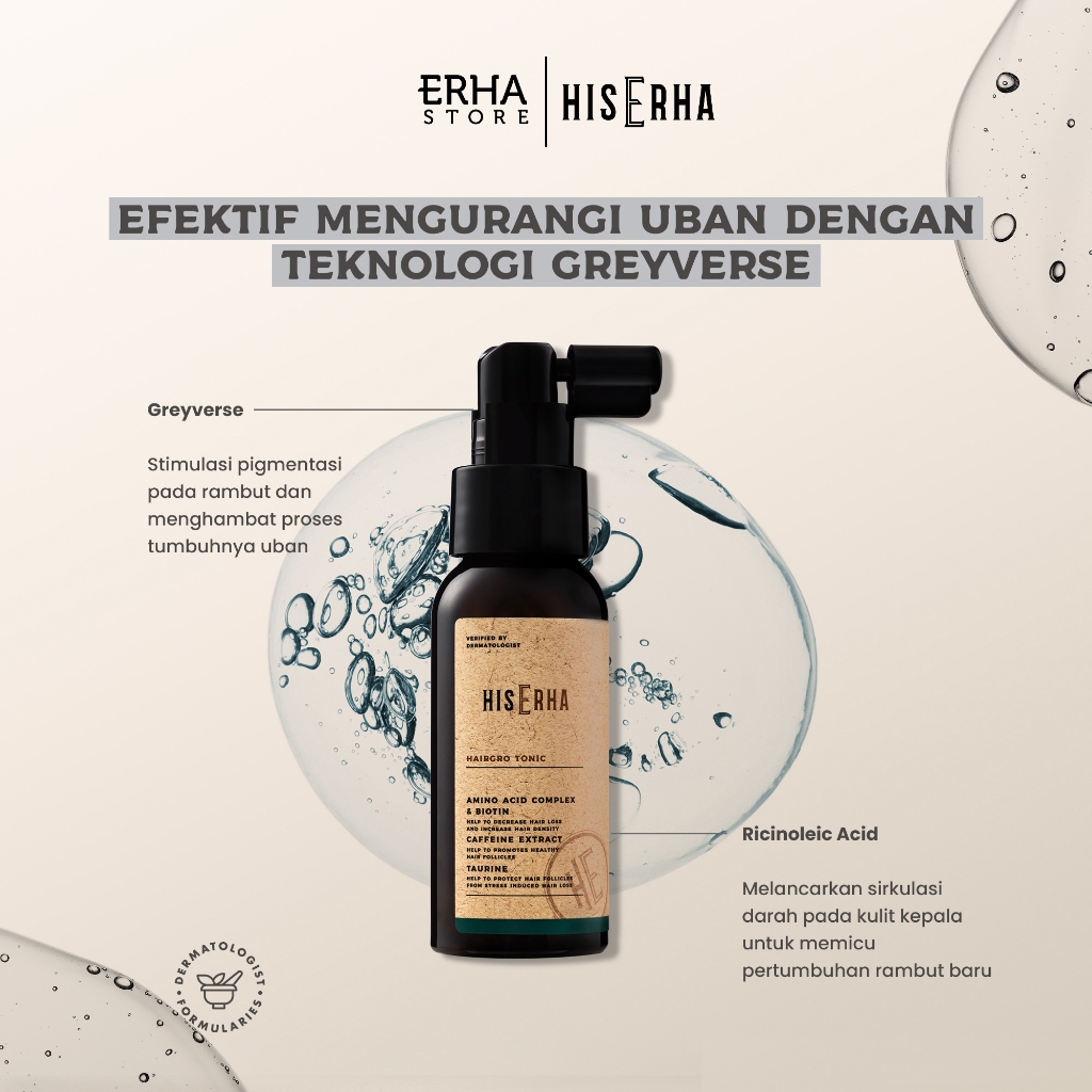 HIS ERHA Grey Tonic 60ml - Tonic Rambut Anti Uban Khusus Pria untuk Mengurangi dan Menghambat Proses Tumbuhnya Uban, Verified by Dermatologist, Greyverse Tech, Ricinoleic Acid