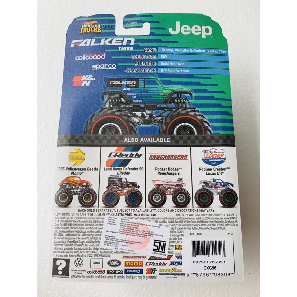 HOTWHEELS HOT WHEELS MONSTER TRUCKS TRUCK 18 JEEP WRANGLER UNLIMITED FALKEN TIRES DIECAST MINIATUR MOBIL MAINAN MOBILAN ANAK GIANT WHEELS