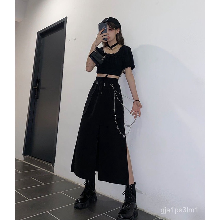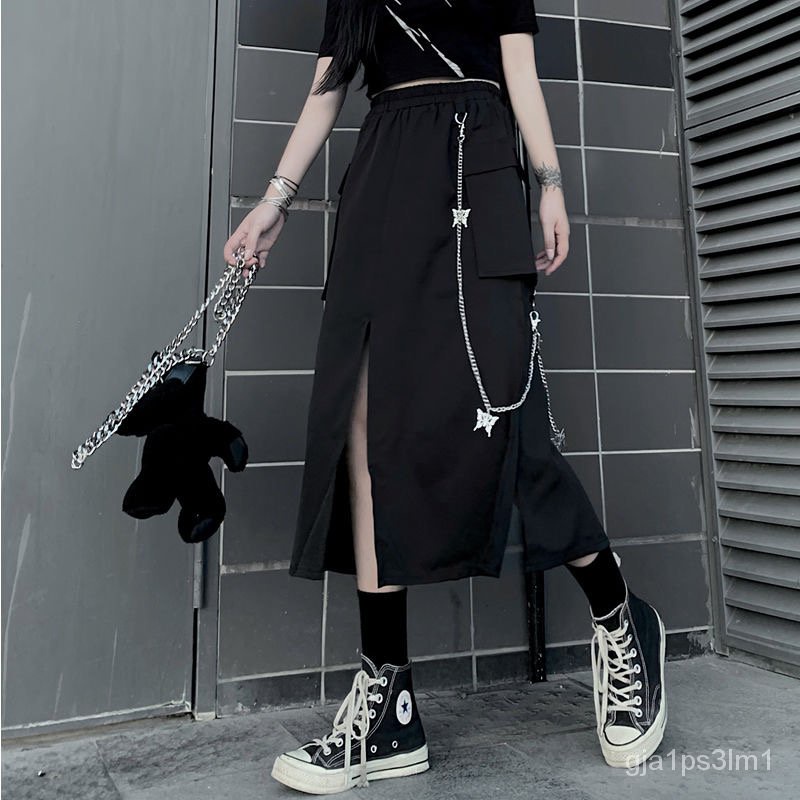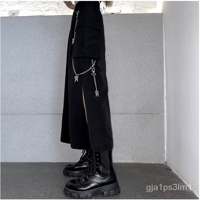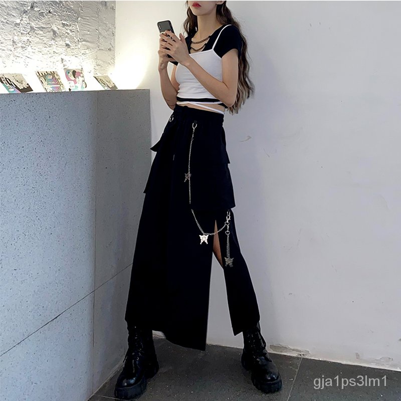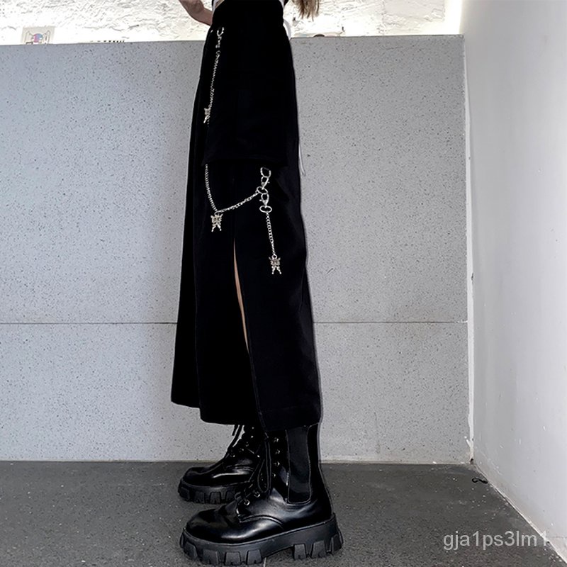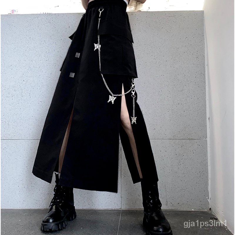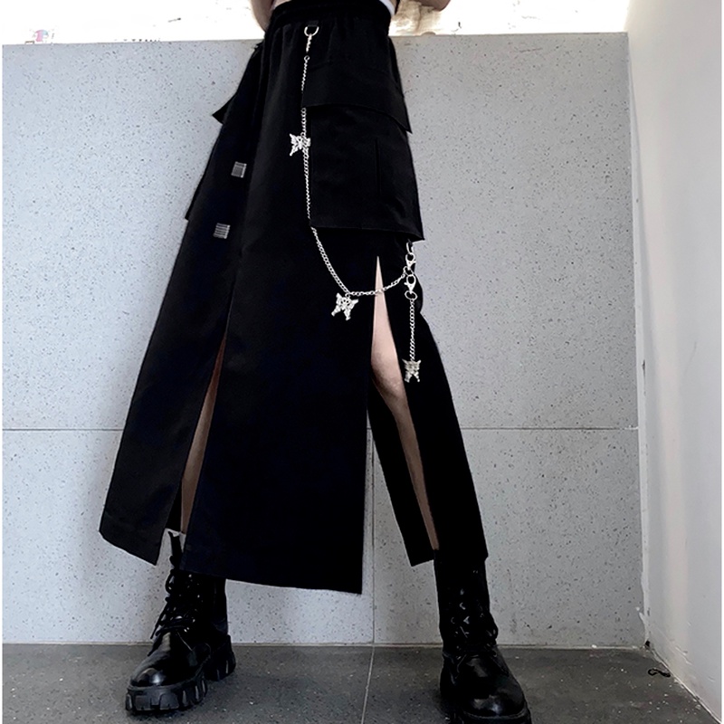 HOUZHOU Goth Punk Cargo Skirt Long Techwear Women Gothic Split Chain Asymmetrical Black Skirt Street