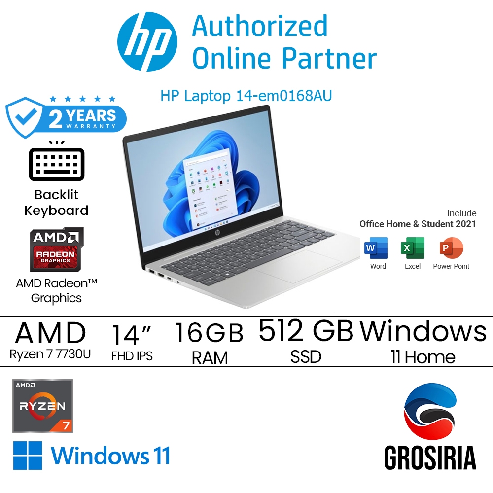 HP Laptop 14 EM0168AU AMD Ryzen 7 7730U 16GB 512GB SSD 14" FHD W11 Silver AD7Q1PA