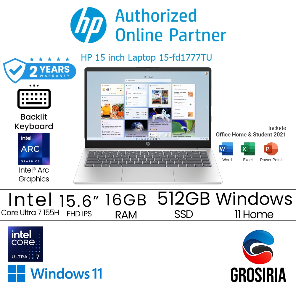 HP Laptop 15 FD1777TU Ultra 7 155H 16GB 512GB SSD 15.6" FHD IPS W11 Silver 9Y3P1PA