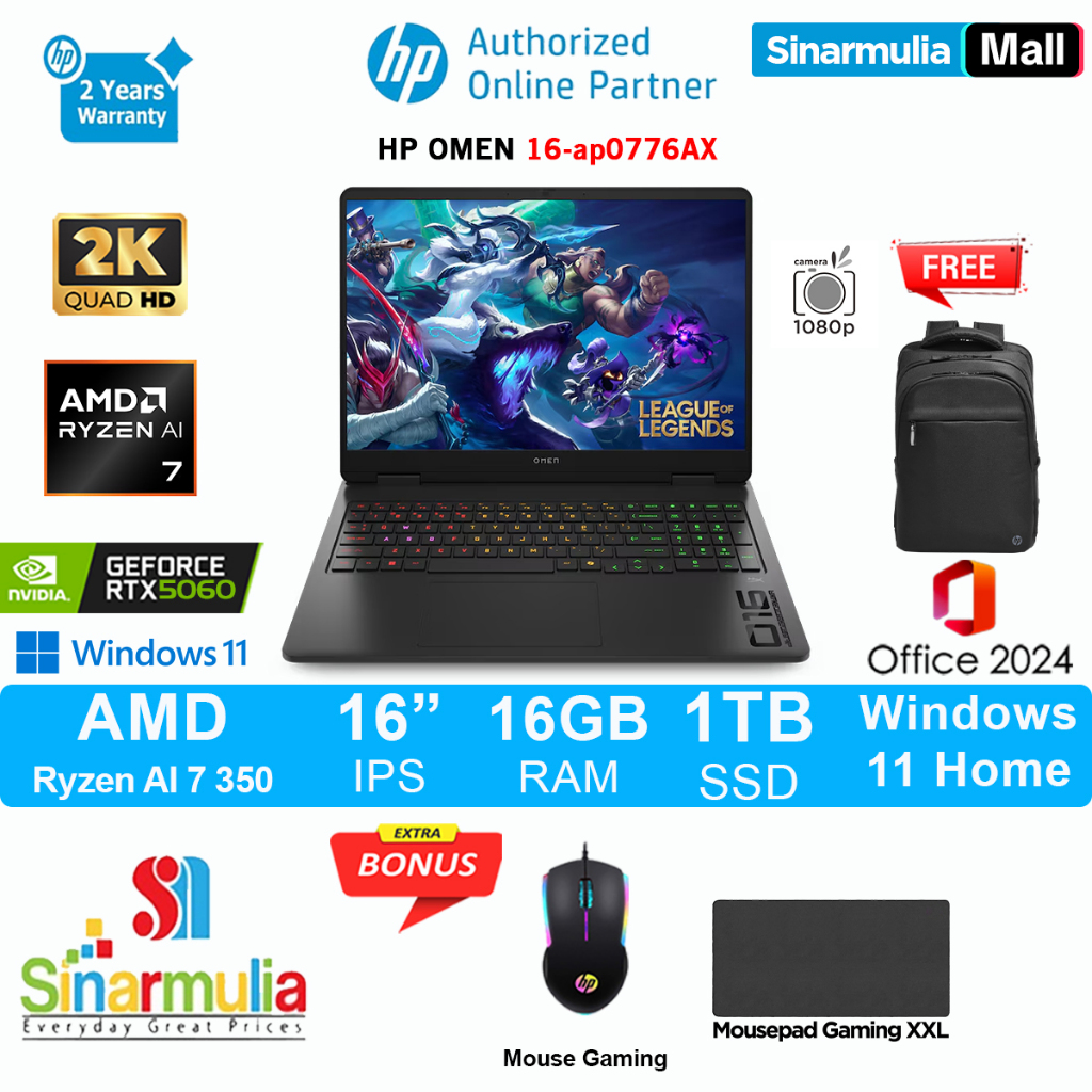HP OMEN 16 NVIDIA® GeForce RTX™ 5060 - Ryzen AI 7 350 1TB SSD 16GB Win11+OHS - ap0776AX