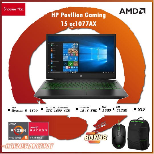 HP Pavilion Gaming 15 ec1077AX - 144Hz AMD Ryzen 5 4600 16GB 512ssd GTX1650 4GB W10+OHS 15.6FHD