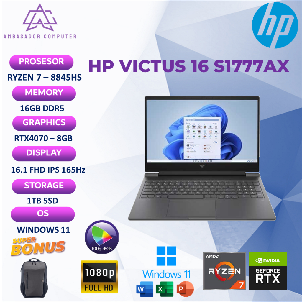 HP Victus 16 S1777AX Ryzen 7 8845HS RTX4070 8GB 16GB 1TB 165Hz Full HD Windows11 OHS