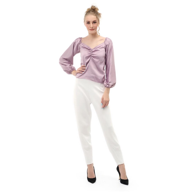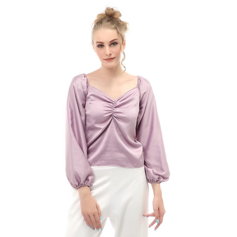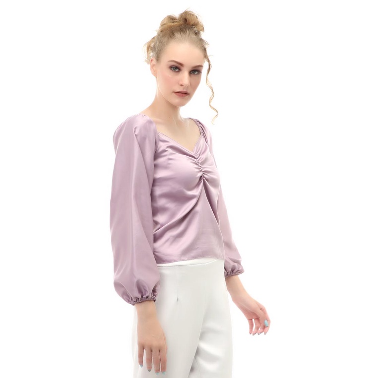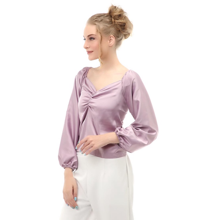 Hamlin Cheva Blouse Casual Wanita Sabrina Kerut Dada Lengan Panjang Material Satin ORIGINAL - Lilac