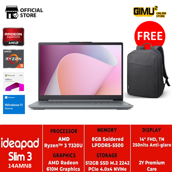 Lenovo IdeaPad Slim 3 14AMN8 Ryzen 3 7320U 8GB 512GB 14' FHD W11 + OHS24 + M365 | Artic Grey