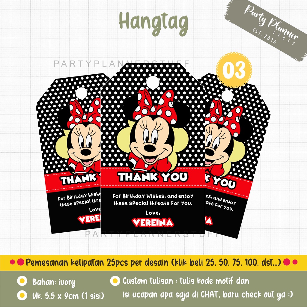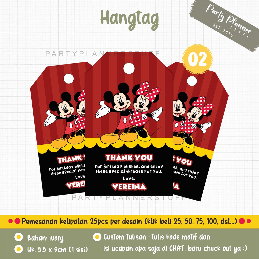 Hangtag / tag souvenir ulang tahun birthday souvenir tag card tema mickey and minnie mouse / tag label ucapan tema mickey minnie mouse custom tulisan