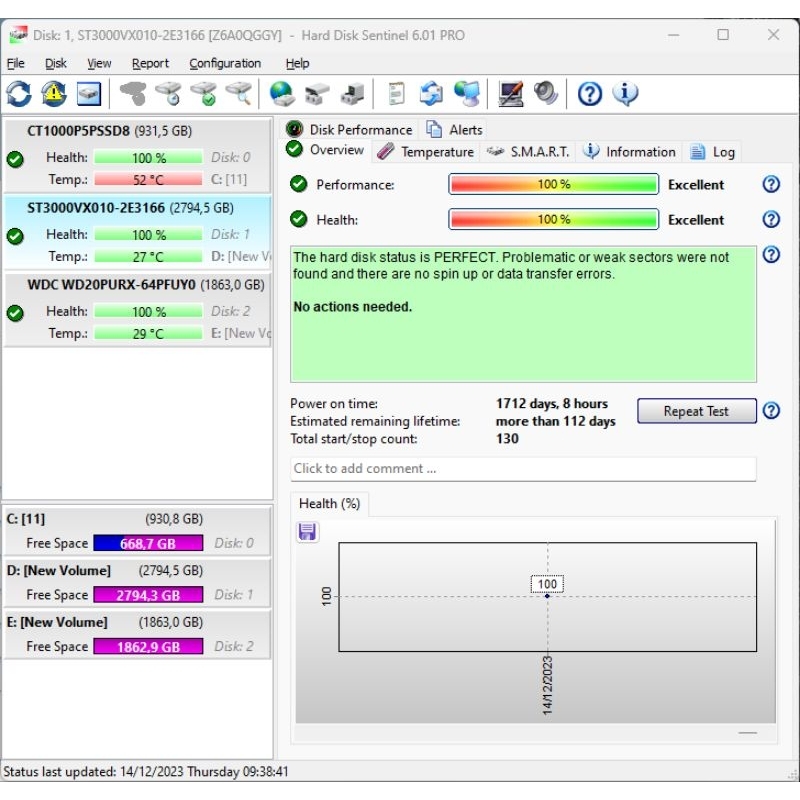 Hard Disk Seagate SkyHawk 3TB HDD CCTV Desktop PC Sentinel Health 100%