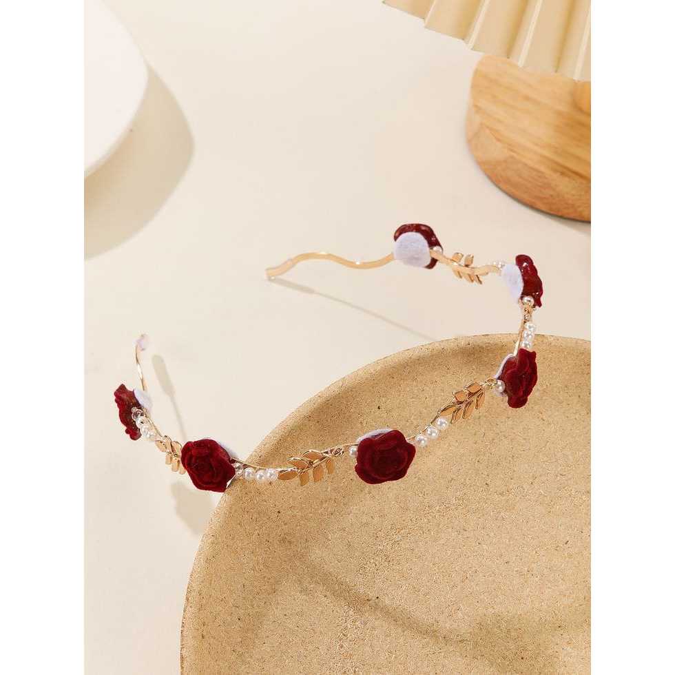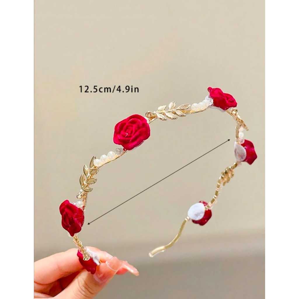 Headpiece bando bunga mawar maroon warna gold dengan tiara